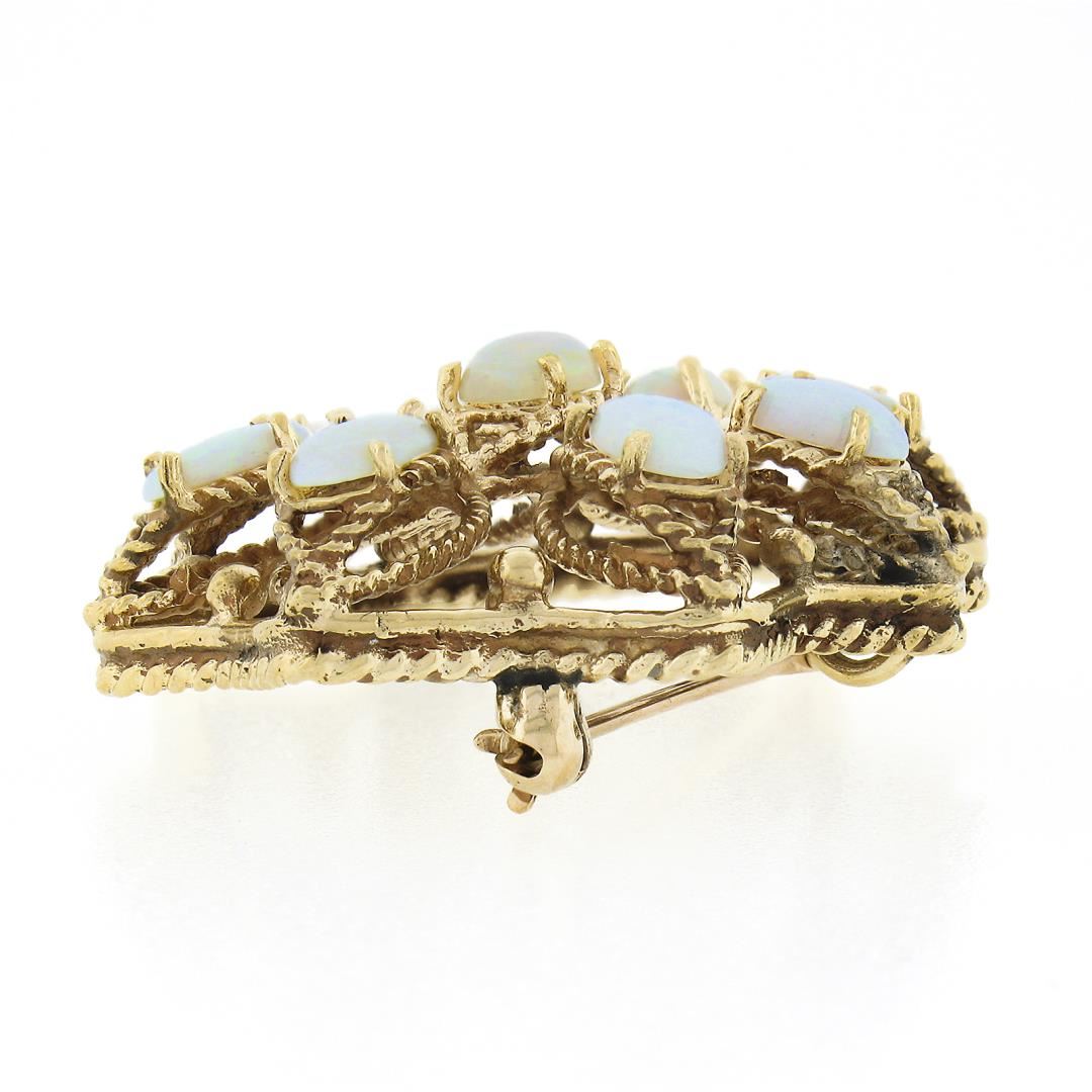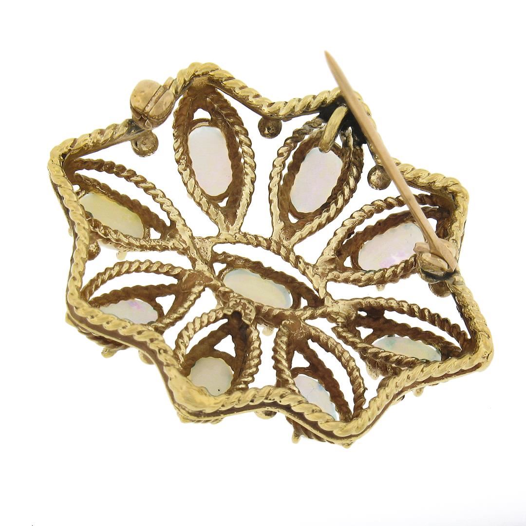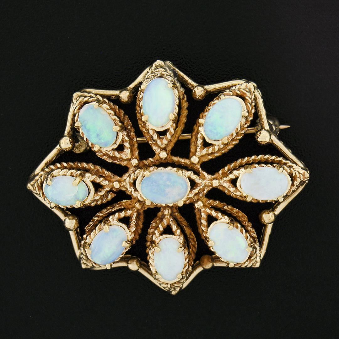 A vintage solid 14k yellow gold brooch pendant, with 9 oval cabochon cut natural opals (6x4mm each). Measures 30x36.3mm and weighs a total of 8.54 grams.