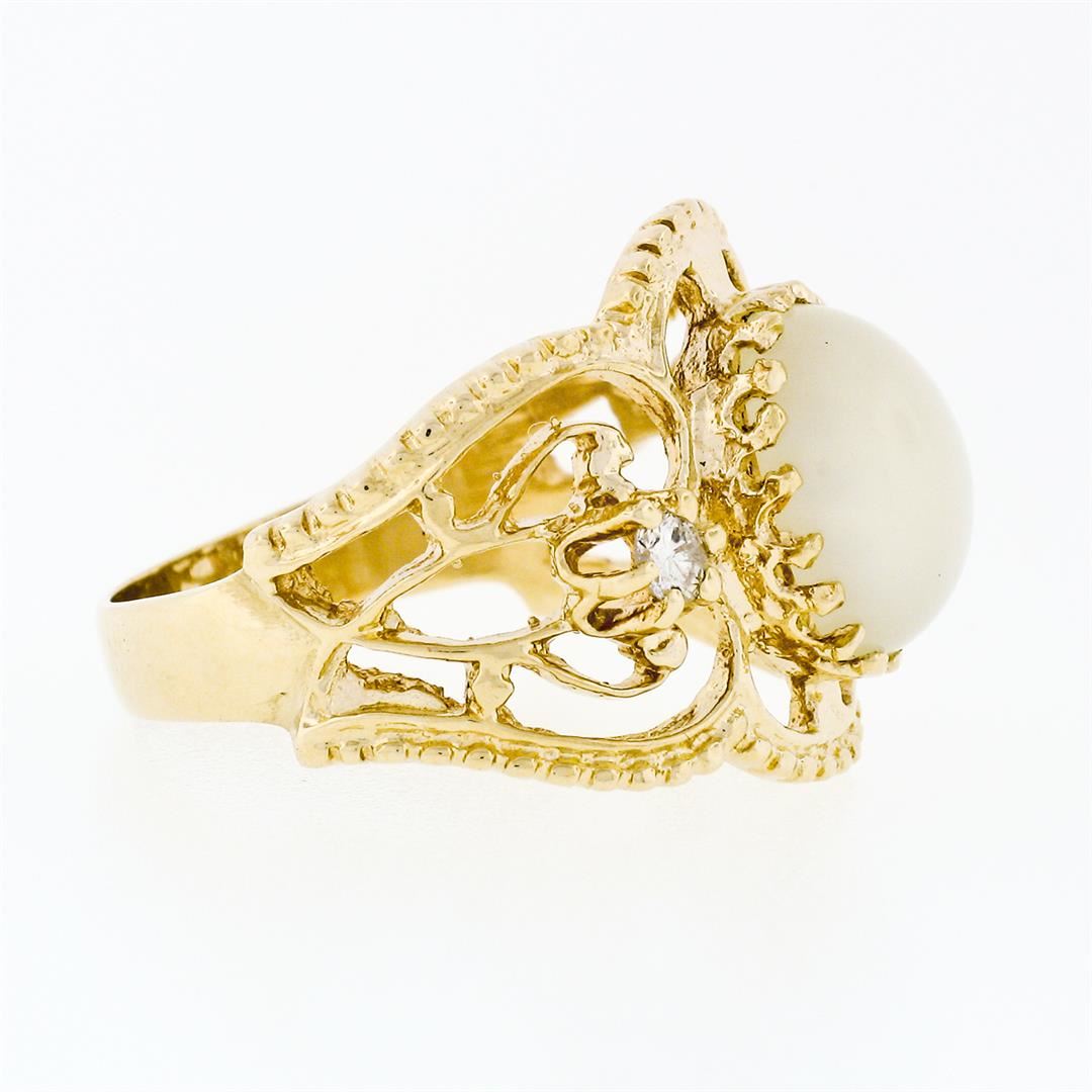 A vintage solid 14k yellow gold cigar cocktail ring, with 1 oval cabochon cut natural cat's eye moonstone (10.0x7.85mm), and 2 round brilliant cut natural diamonds (H/I - VS2/SI1 ; 0.14ctw). The ring is size 7, weighs a total of 4.93 grams, and measures 16.25mm wide.