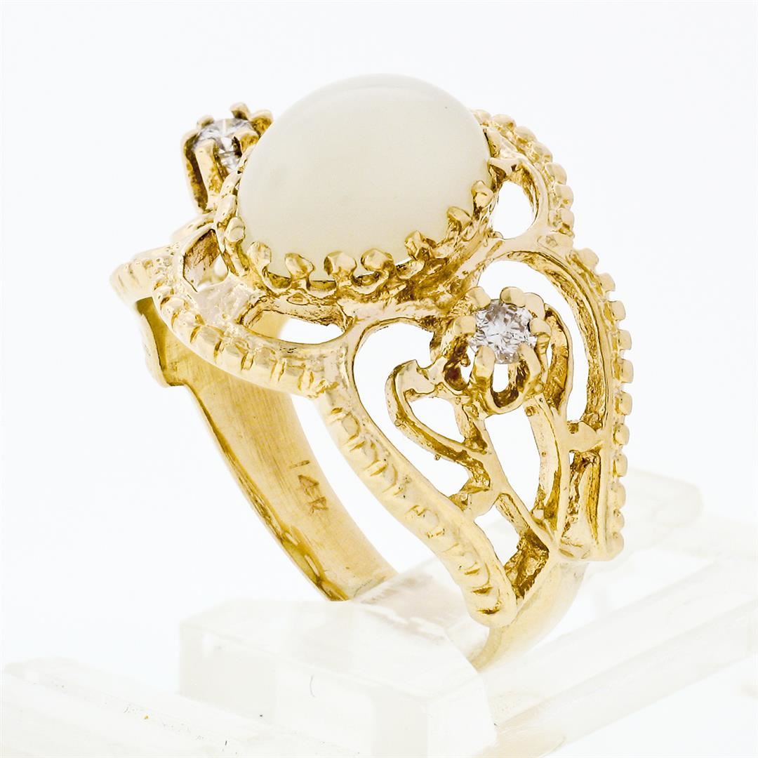 A vintage solid 14k yellow gold cigar cocktail ring, with 1 oval cabochon cut natural cat's eye moonstone (10.0x7.85mm), and 2 round brilliant cut natural diamonds (H/I - VS2/SI1 ; 0.14ctw). The ring is size 7, weighs a total of 4.93 grams, and measures 16.25mm wide.