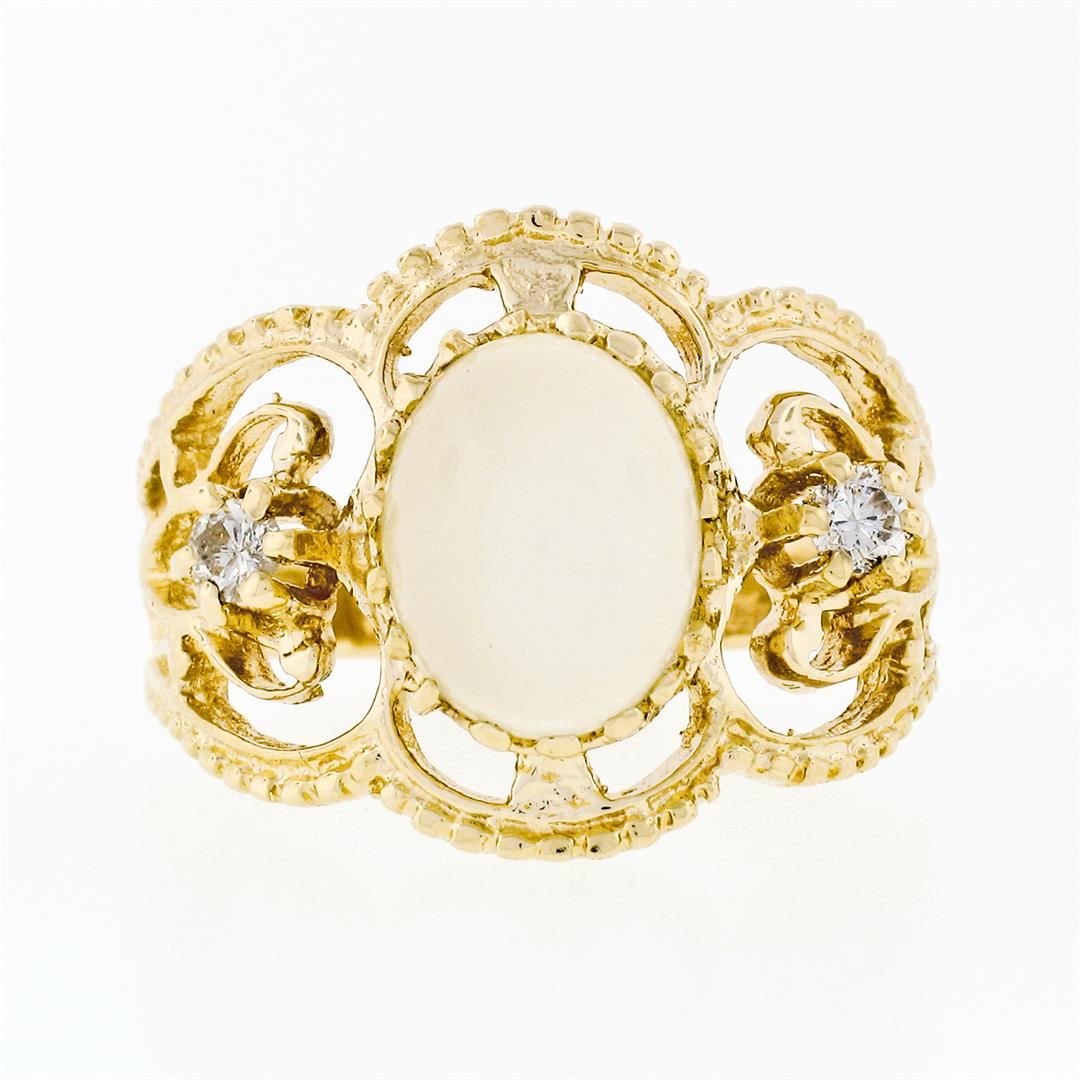 A vintage solid 14k yellow gold cigar cocktail ring, with 1 oval cabochon cut natural cat's eye moonstone (10.0x7.85mm), and 2 round brilliant cut natural diamonds (H/I - VS2/SI1 ; 0.14ctw). The ring is size 7, weighs a total of 4.93 grams, and measures 16.25mm wide.