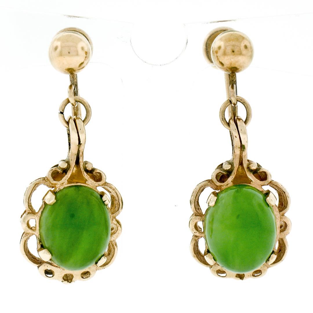 A vintage pair of dangle earring featuring a pair of oval cabochon cut green jades measuring approximately 9.7x8.0mm. The earrings measure approximately 28.5x11.6mm and weigh a total of 4.82 grams.
