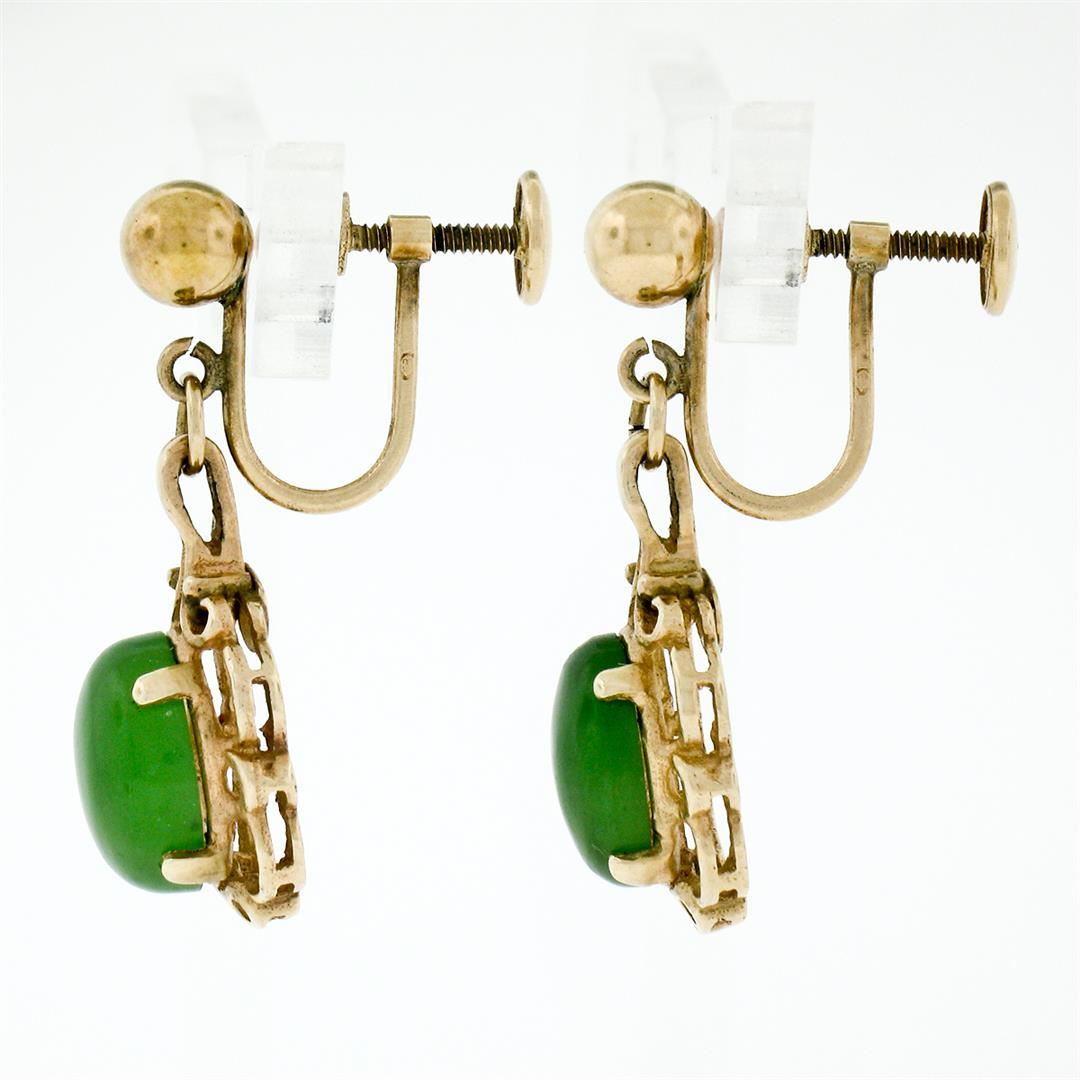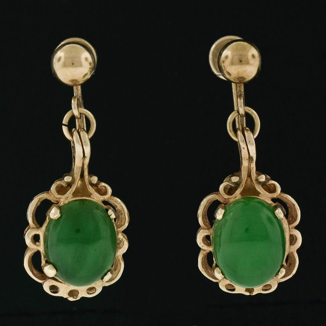 A vintage pair of dangle earring featuring a pair of oval cabochon cut green jades measuring approximately 9.7x8.0mm. The earrings measure approximately 28.5x11.6mm and weigh a total of 4.82 grams.