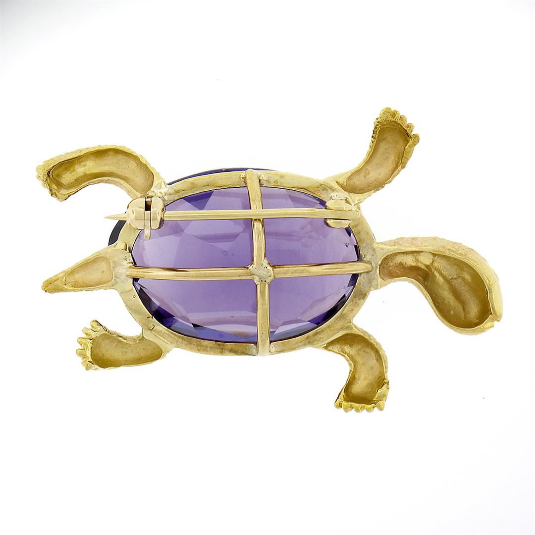 A vintage solid 14k yellow gold turtle pin brooch, with 1 oval brilliant cut purple stone (24.1x16.4mm). Measures 28.0x41.90mm and weighs a total of 11.40 grams.