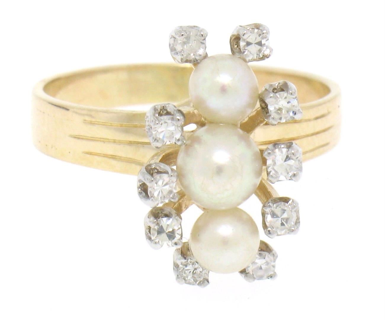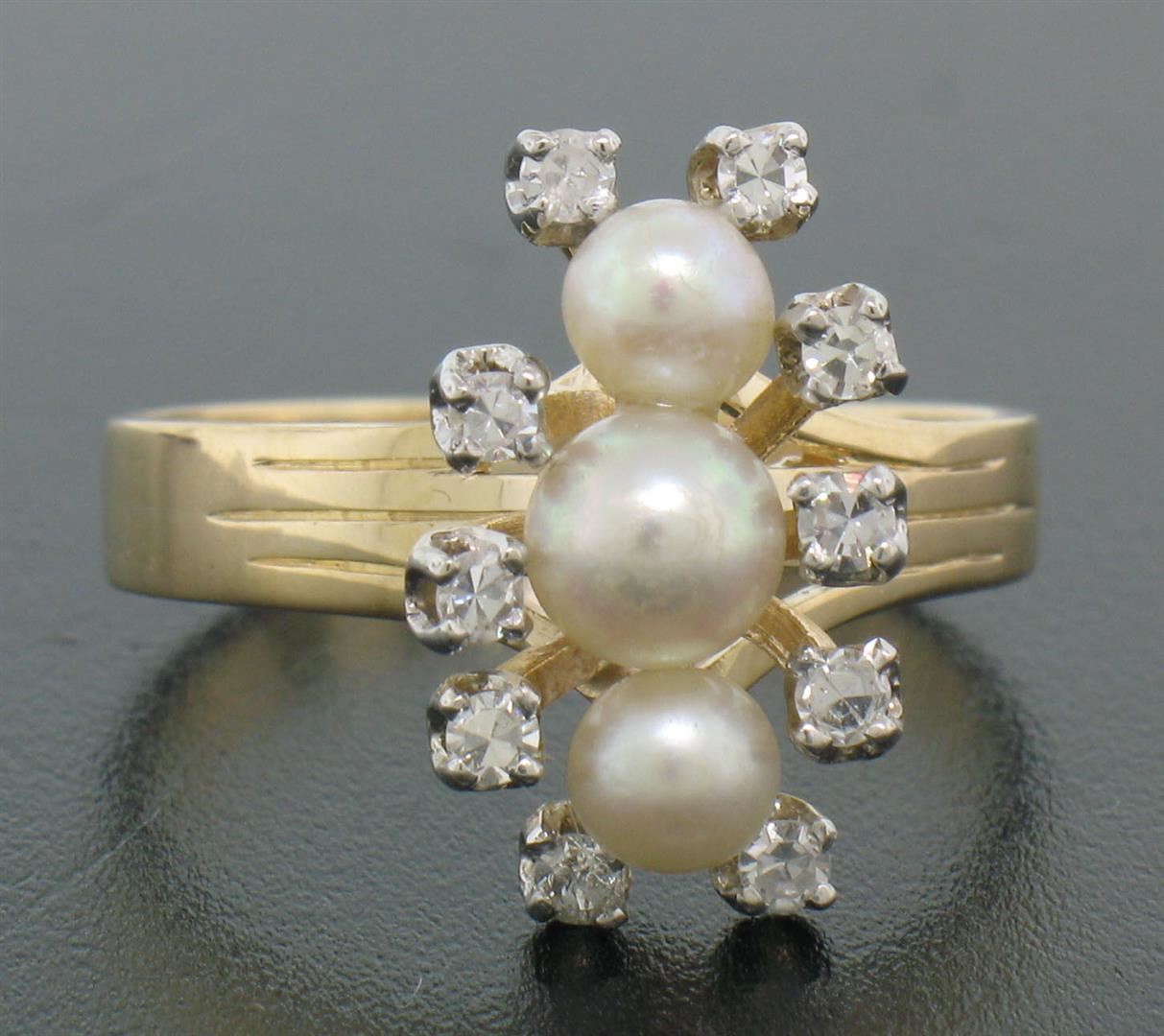 A vintage solid 14k yellow gold elongated dinner ring, with 3 natural genuine cultured akoya pearls (), surrounded with 10 single cut natural diamonds (F- VS1; 0.20ctw). The ring is size 7.75, weighs a total of 4.08 grams, and measures 10.03mm wide.