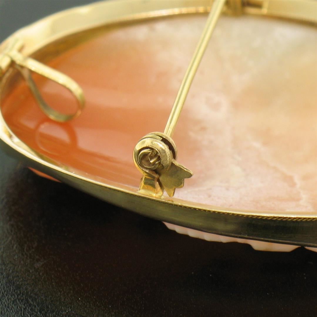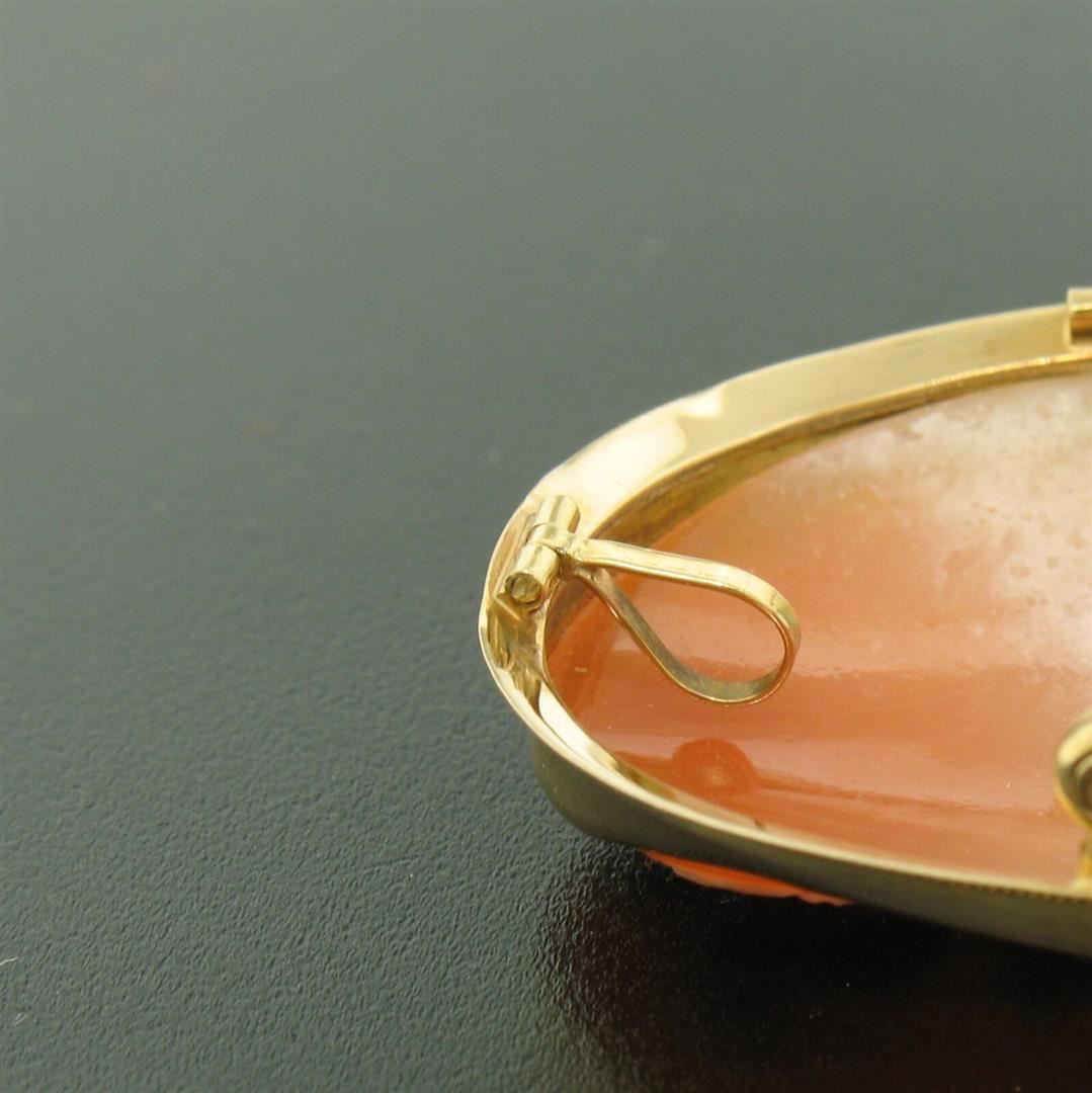 A vintage solid 14k yellow gold brooch or pendant. featuring 1 oval shape carved natural shell cameo (39.5x30.7mm). Measures 42.8x33.1mm and weighs a total of 7.6 grams.