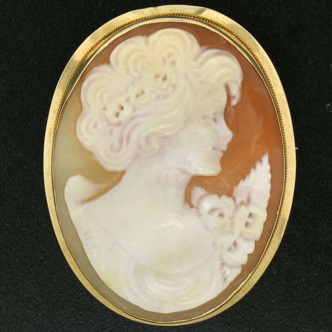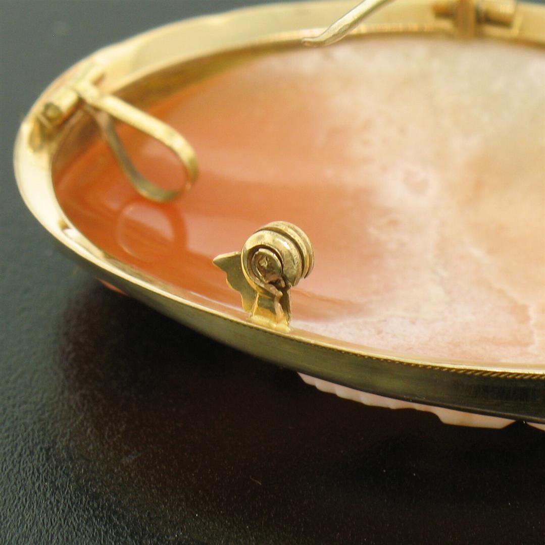A vintage solid 14k yellow gold brooch or pendant. featuring 1 oval shape carved natural shell cameo (39.5x30.7mm). Measures 42.8x33.1mm and weighs a total of 7.6 grams.