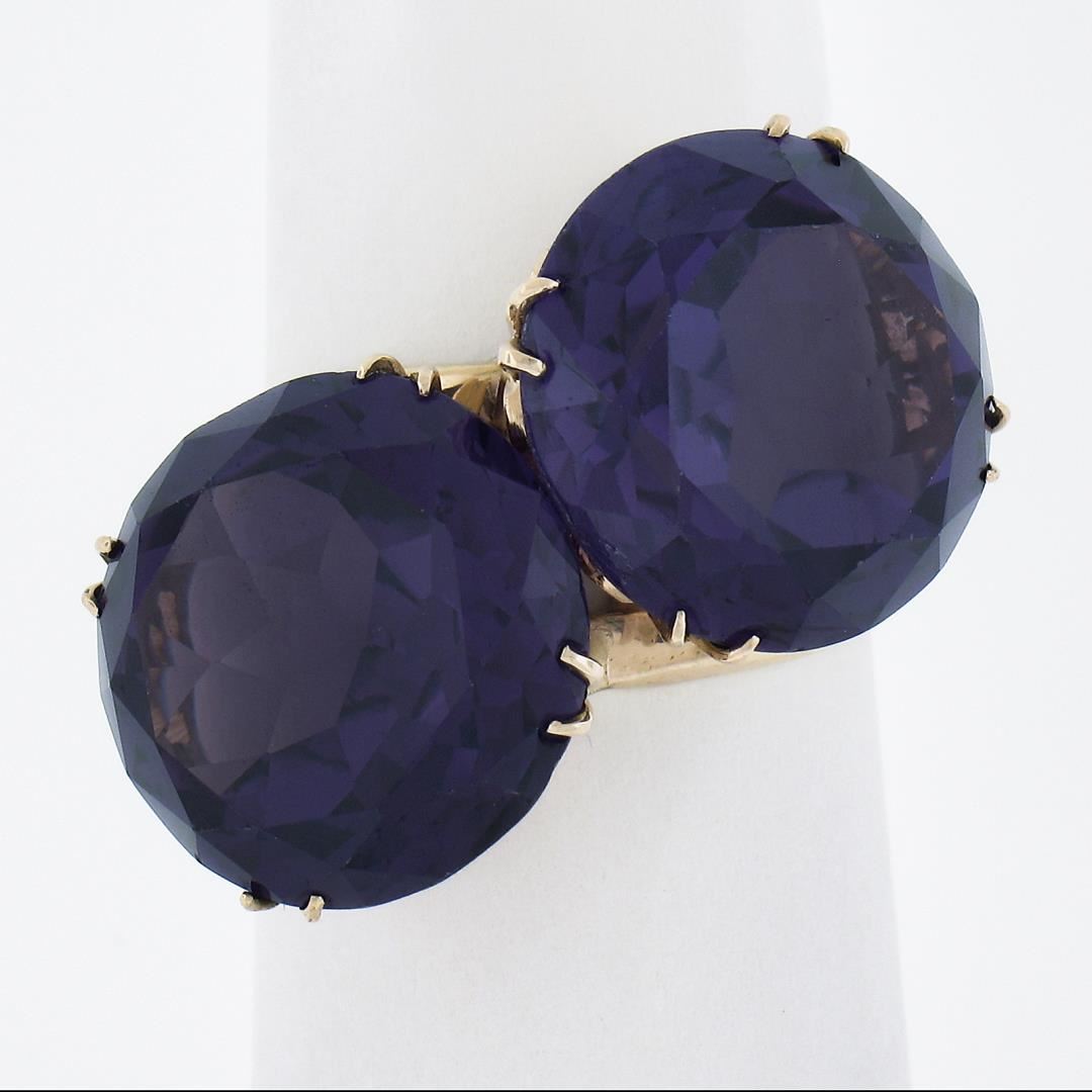 A vintage 14k yellow gold bypass ring, with 2 round cut synthetic alexandrites (13.4mm). The ring is size 6.0, weighs a total of 7.88 grams, and measures 22mm wide.