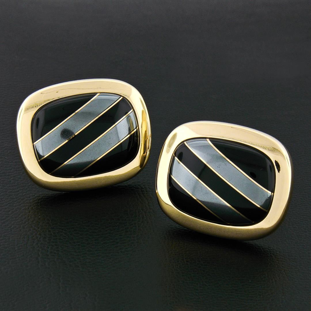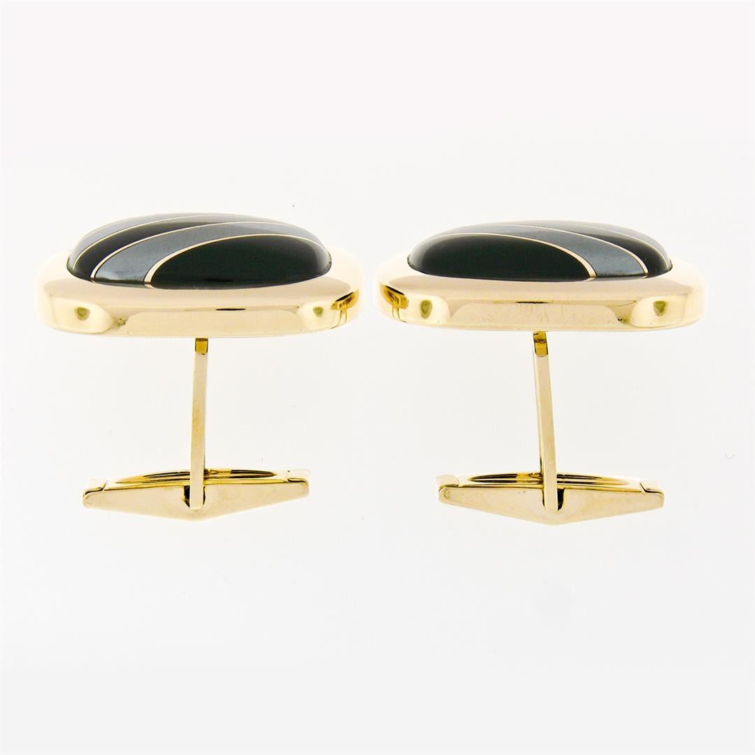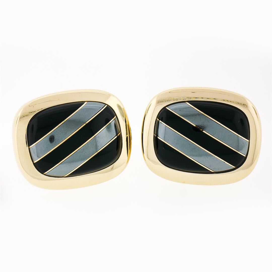 A vintage pair of 14k yellow gold cuff links set with a pair of unique composite stones made from alternating bands of black onyx and hematite (22.5x17.0mm). These cuff links have a swivel back design with a clearance of 14.5mm, weigh a total of 21.77 grams, and the front panels measure 28.65xmm.