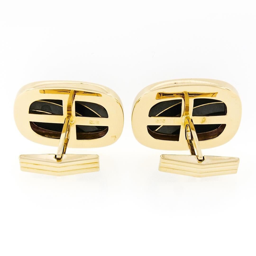 A vintage pair of 14k yellow gold cuff links set with a pair of unique composite stones made from alternating bands of black onyx and hematite (22.5x17.0mm). These cuff links have a swivel back design with a clearance of 14.5mm, weigh a total of 21.77 grams, and the front panels measure 28.65xmm.