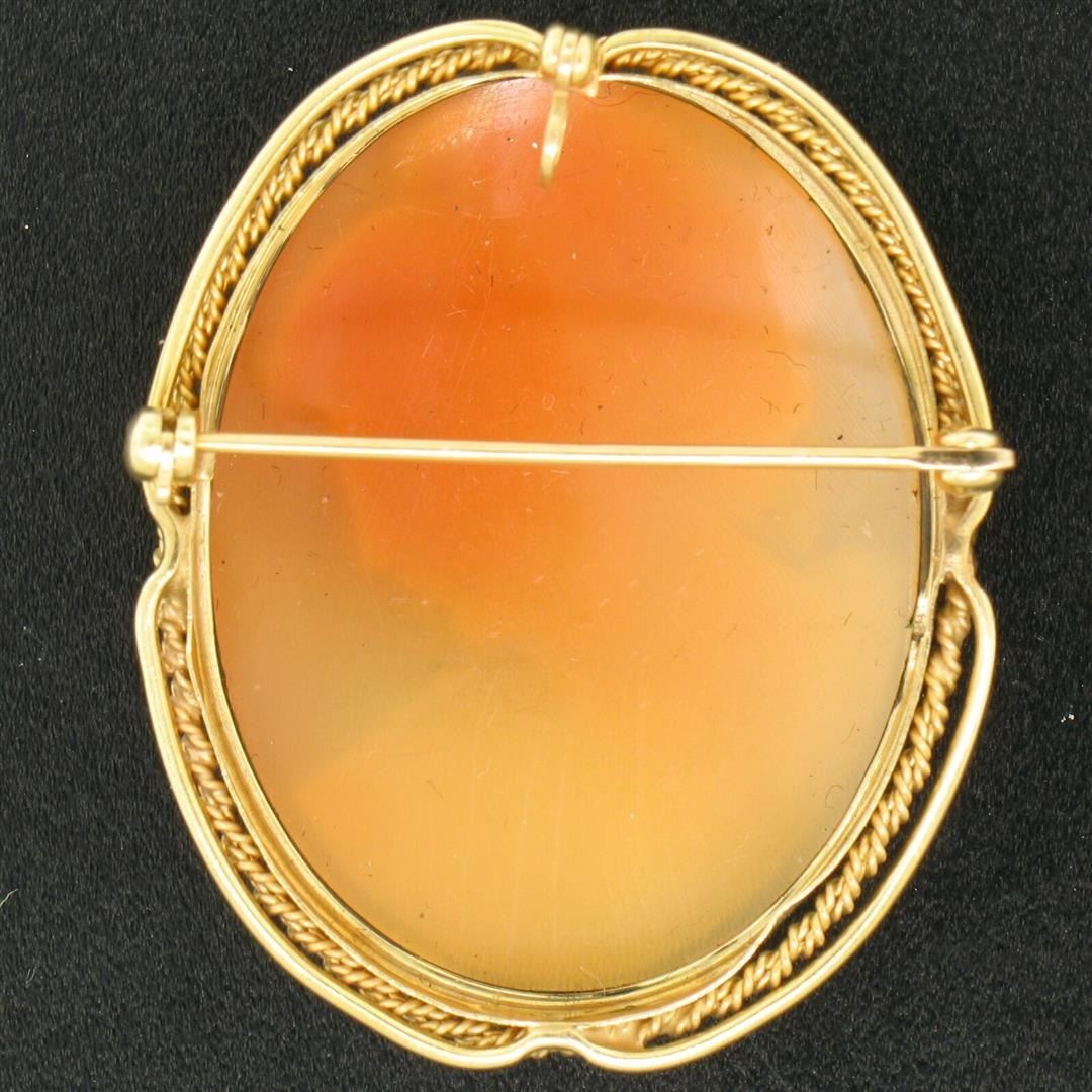 A vintage solid 14k yellow gold brooch or pendant. featuring 1 oval shape carved natural shell cameo (35.3x27.1mm). Measures 38.25x31.25mm and weighs a total of 7.4 grams.