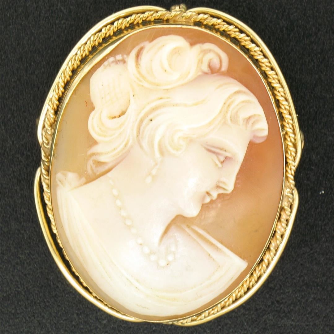 A vintage solid 14k yellow gold brooch or pendant. featuring 1 oval shape carved natural shell cameo (35.3x27.1mm). Measures 38.25x31.25mm and weighs a total of 7.4 grams.