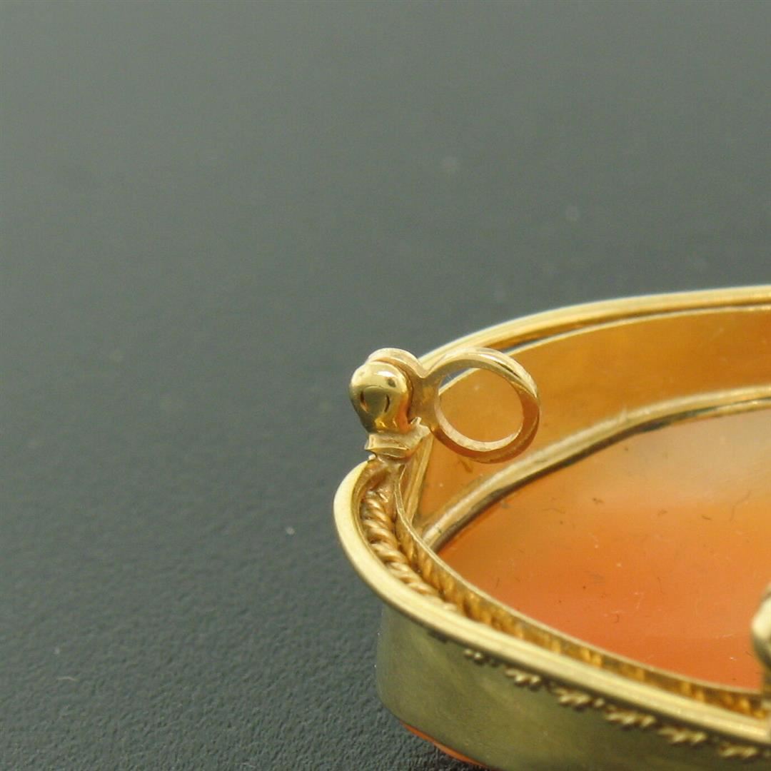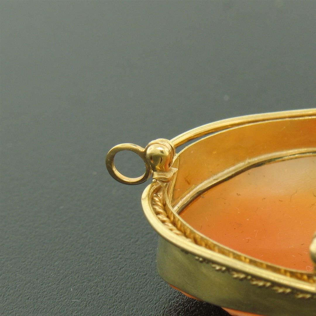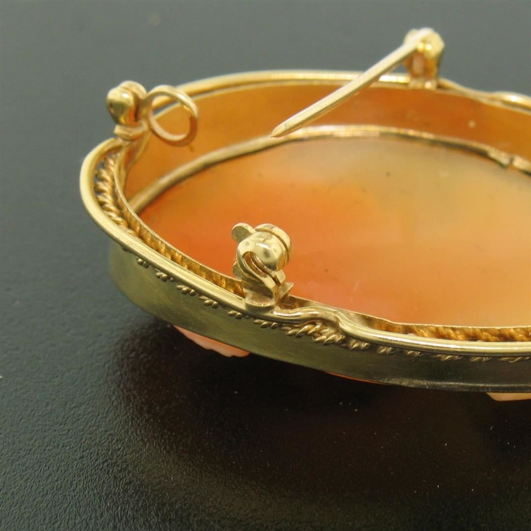 A vintage solid 14k yellow gold brooch or pendant. featuring 1 oval shape carved natural shell cameo (35.3x27.1mm). Measures 38.25x31.25mm and weighs a total of 7.4 grams.