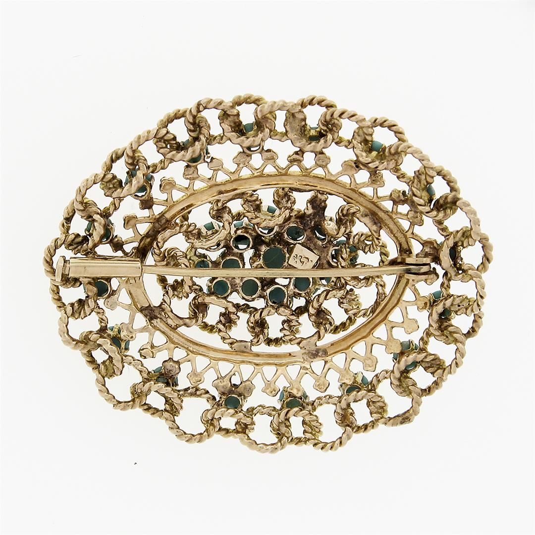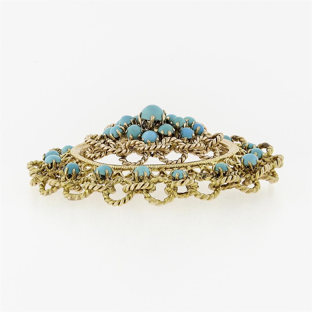 A vintage solid 14k yellow gold pin brooch, with 1 round cabochon cut natural trquoise (4.45mm), and 30 round cabochon cut natural turquoise (2.8mm to 3.2mm). Measures 38.70x47.19mm and weighs a total of 13.80 grams.