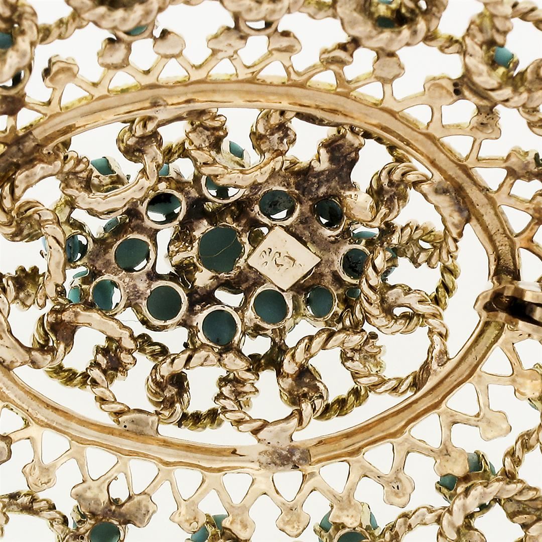 A vintage solid 14k yellow gold pin brooch, with 1 round cabochon cut natural trquoise (4.45mm), and 30 round cabochon cut natural turquoise (2.8mm to 3.2mm). Measures 38.70x47.19mm and weighs a total of 13.80 grams.