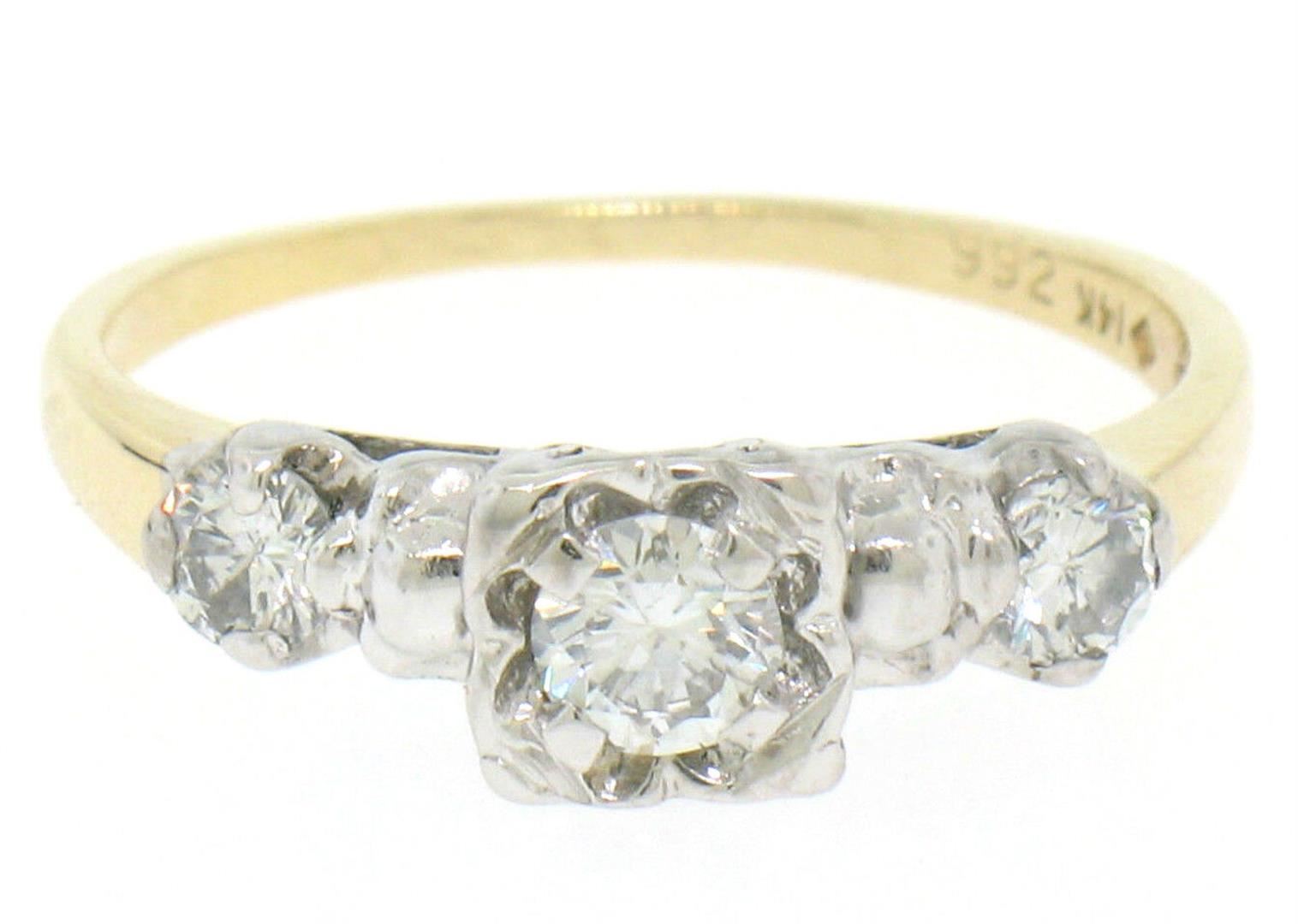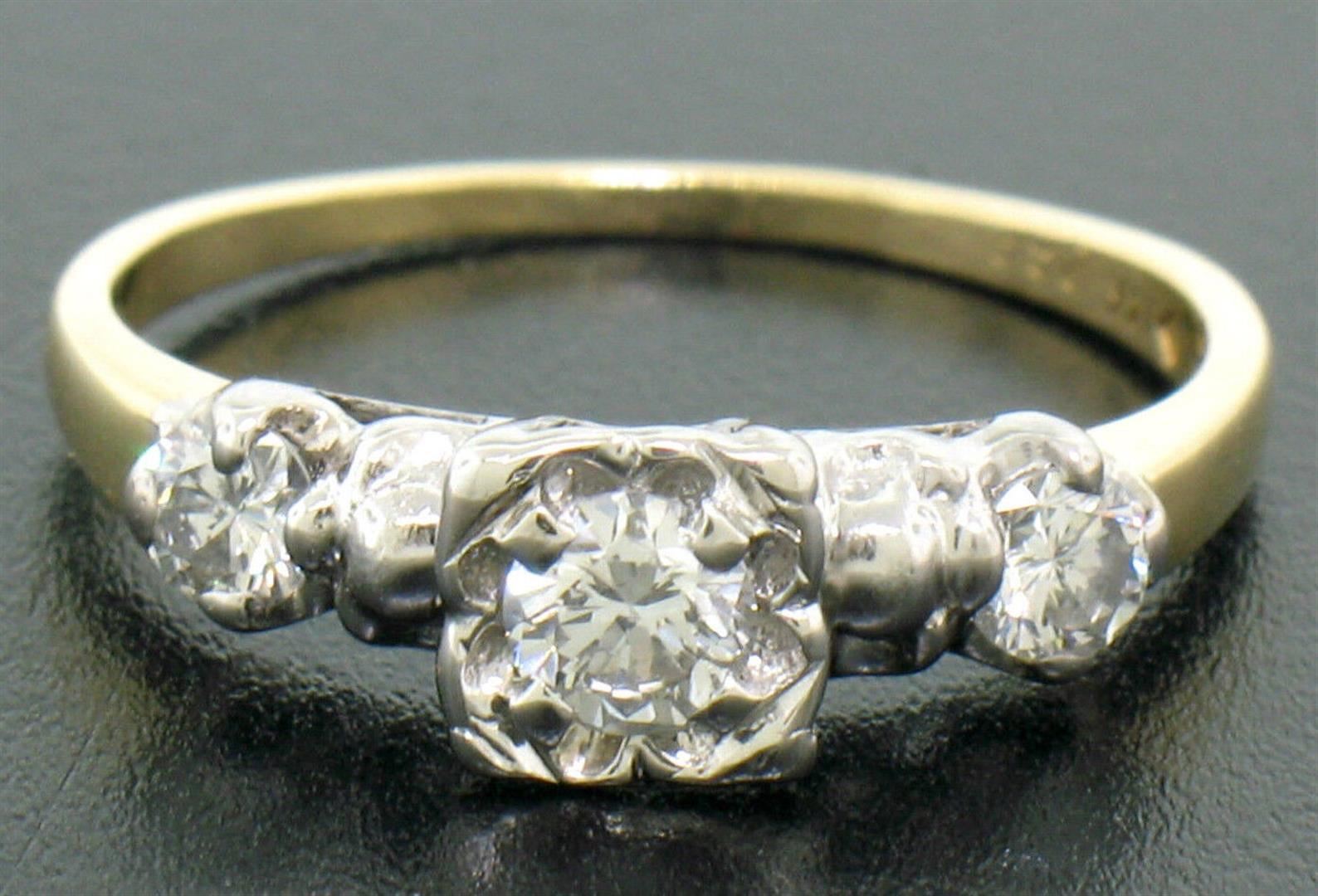 A vintage solid 14k yellow and white gold three stones ring, with 1 round brilliant cut natural diamond (F/G - VS2/SI1 ; 0.20ct), and 2 round brilliant cut natural diamonds (F/G - VS2/SI1 ; 0.20ctw). The ring is size 6.25, weighs a total of 2.10 grams, and measures 5.65mm wide.