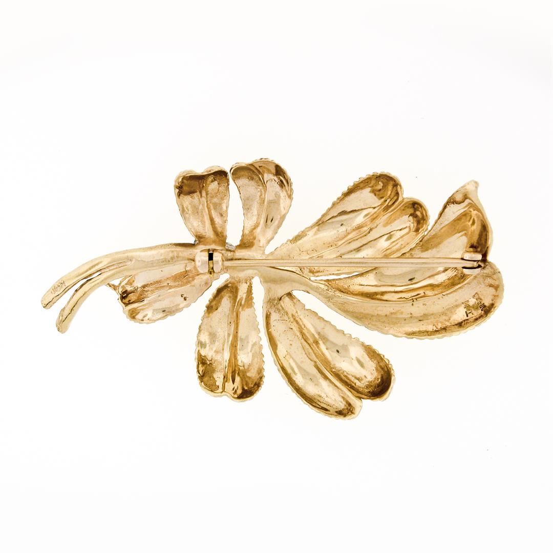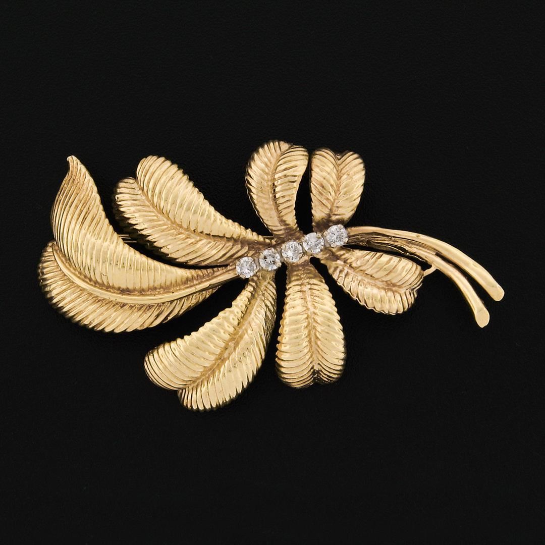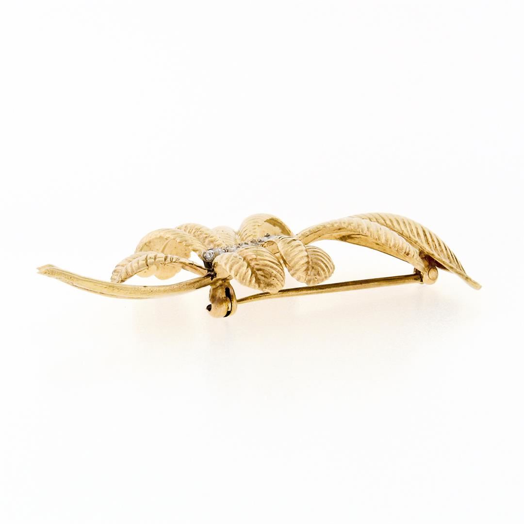 A vintage solid 14k yellow gold leaf branch pin brooch, with 5 round brilliant cut natural diamonds (G - SI1/SI2 ; 0.25ctw). Measures 54.16x32.09mm and weighs a total of 8.91 grams.
