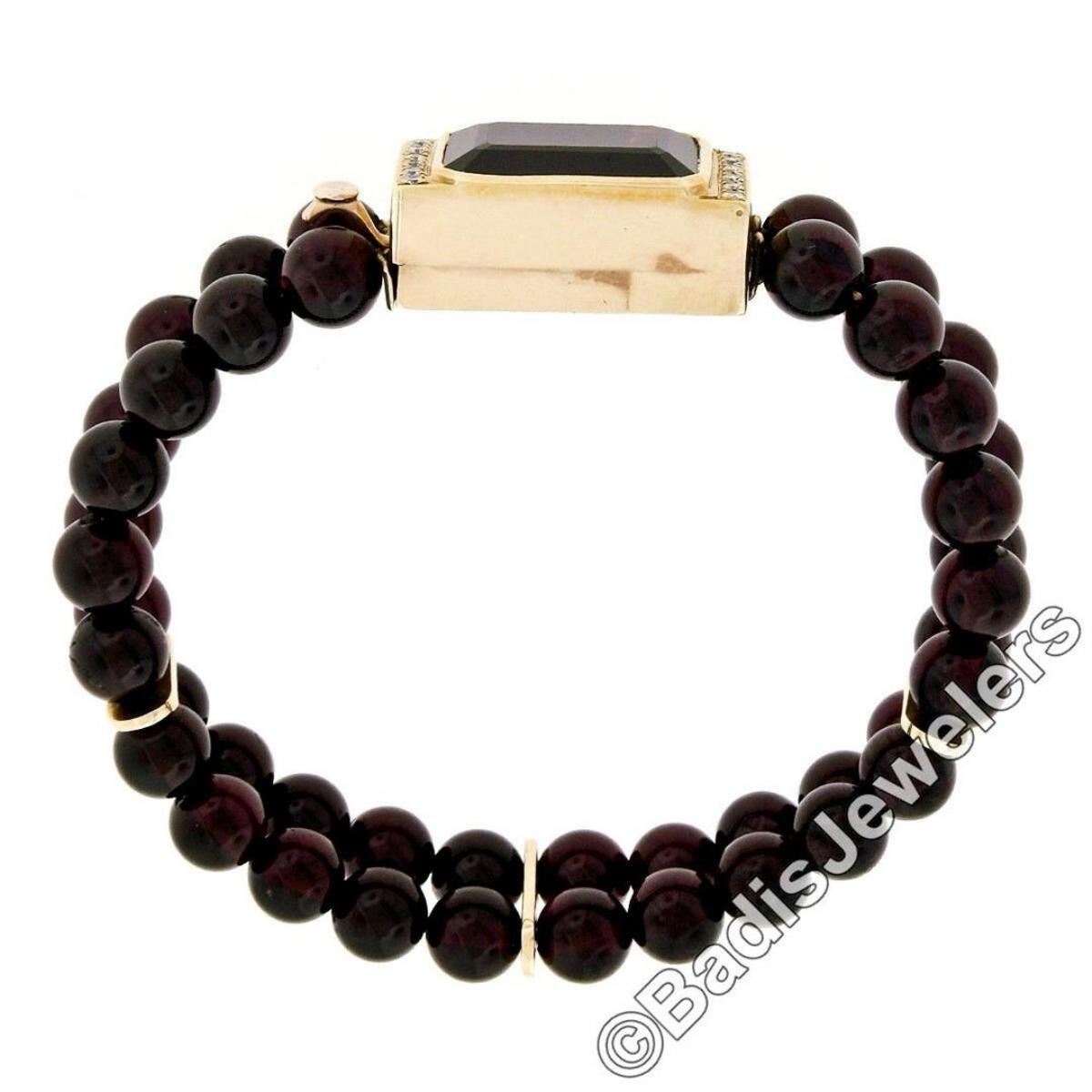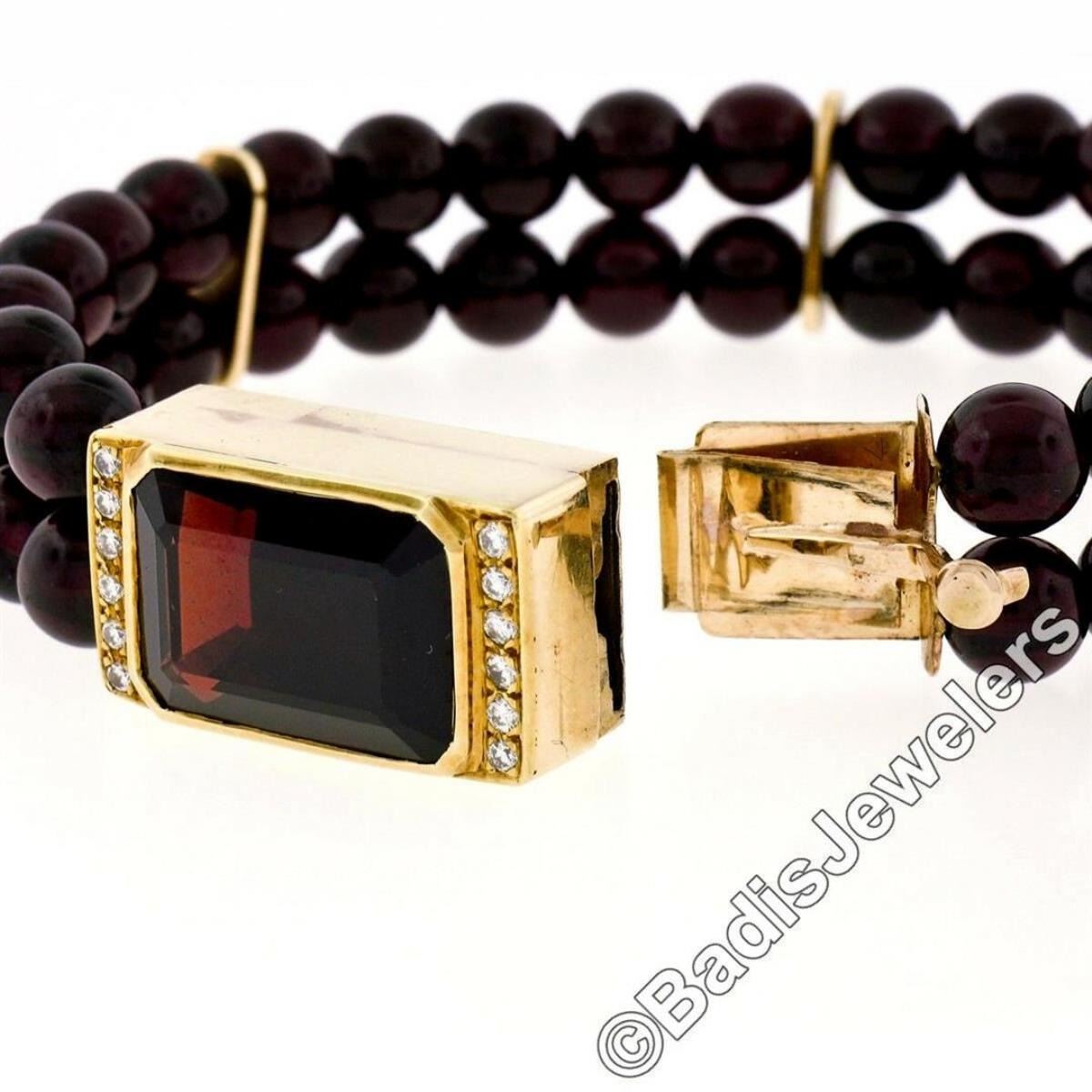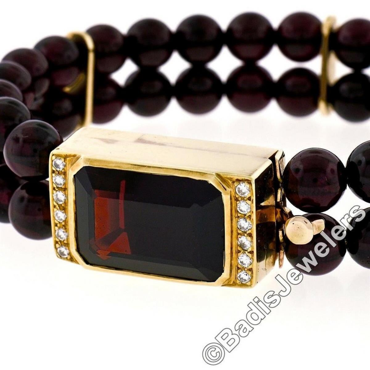 A vintage, dual strand, 44 round garnet bead bracelet crafted from 14kt yellow gold featuring a large 12.50 ct emerald cut garnet and 0.24ctw round brilliant diamond (F/G - VS1/VS2) centerpiece. It weighs a total of 49.53 grams, measures 13.65mm wide, and will comfortably fit up to a 6.5 inch wrist.