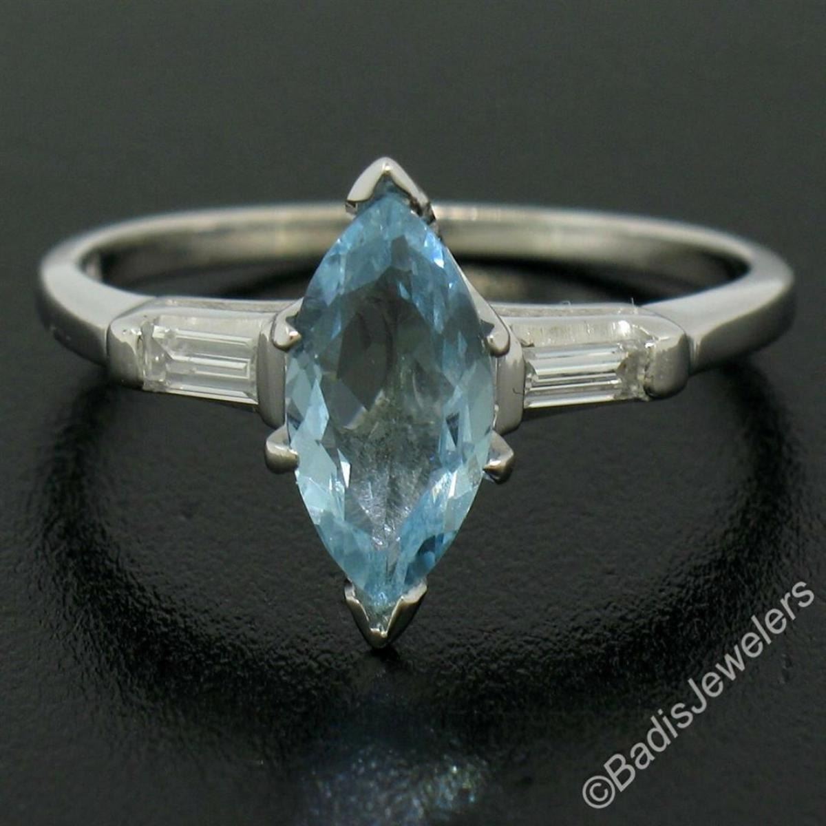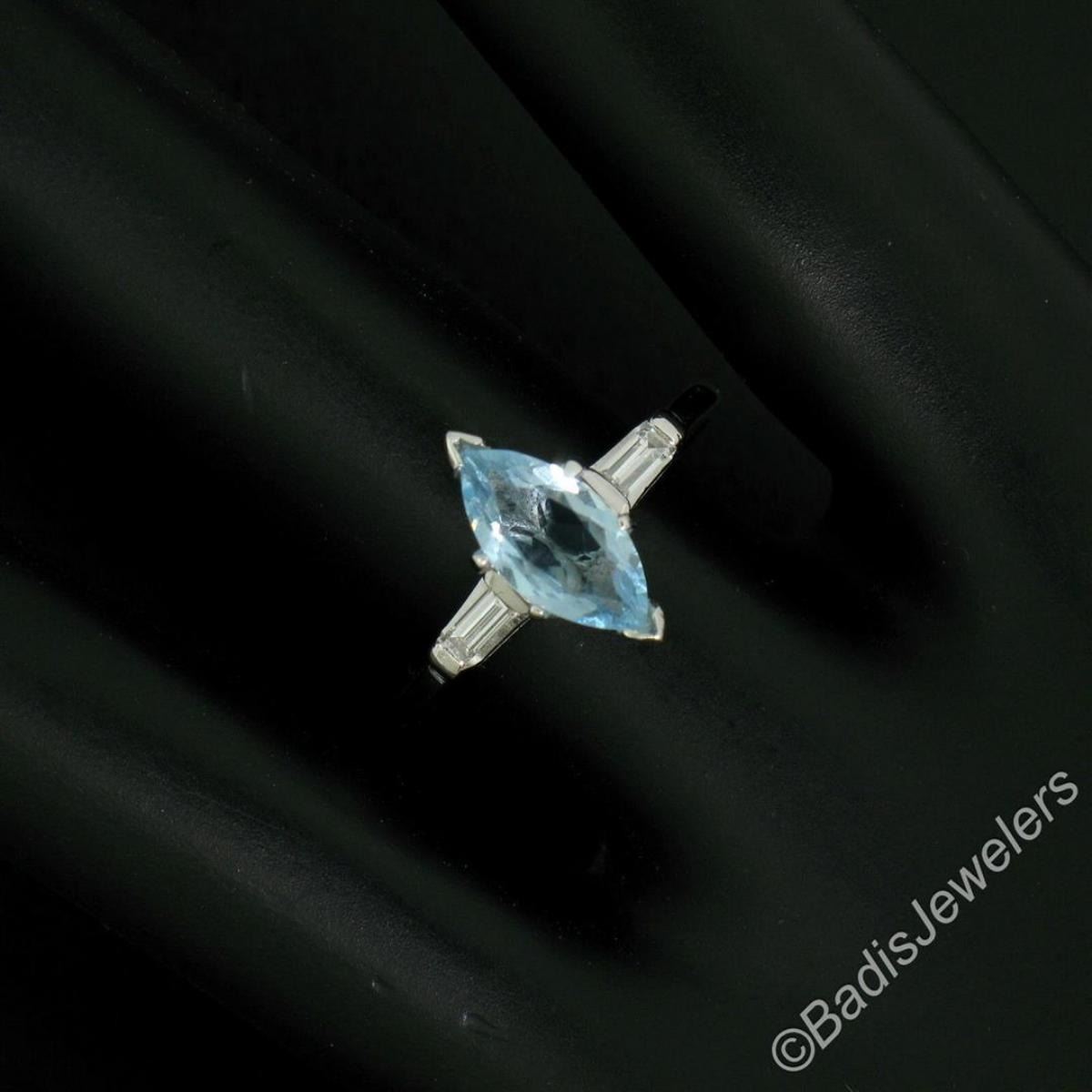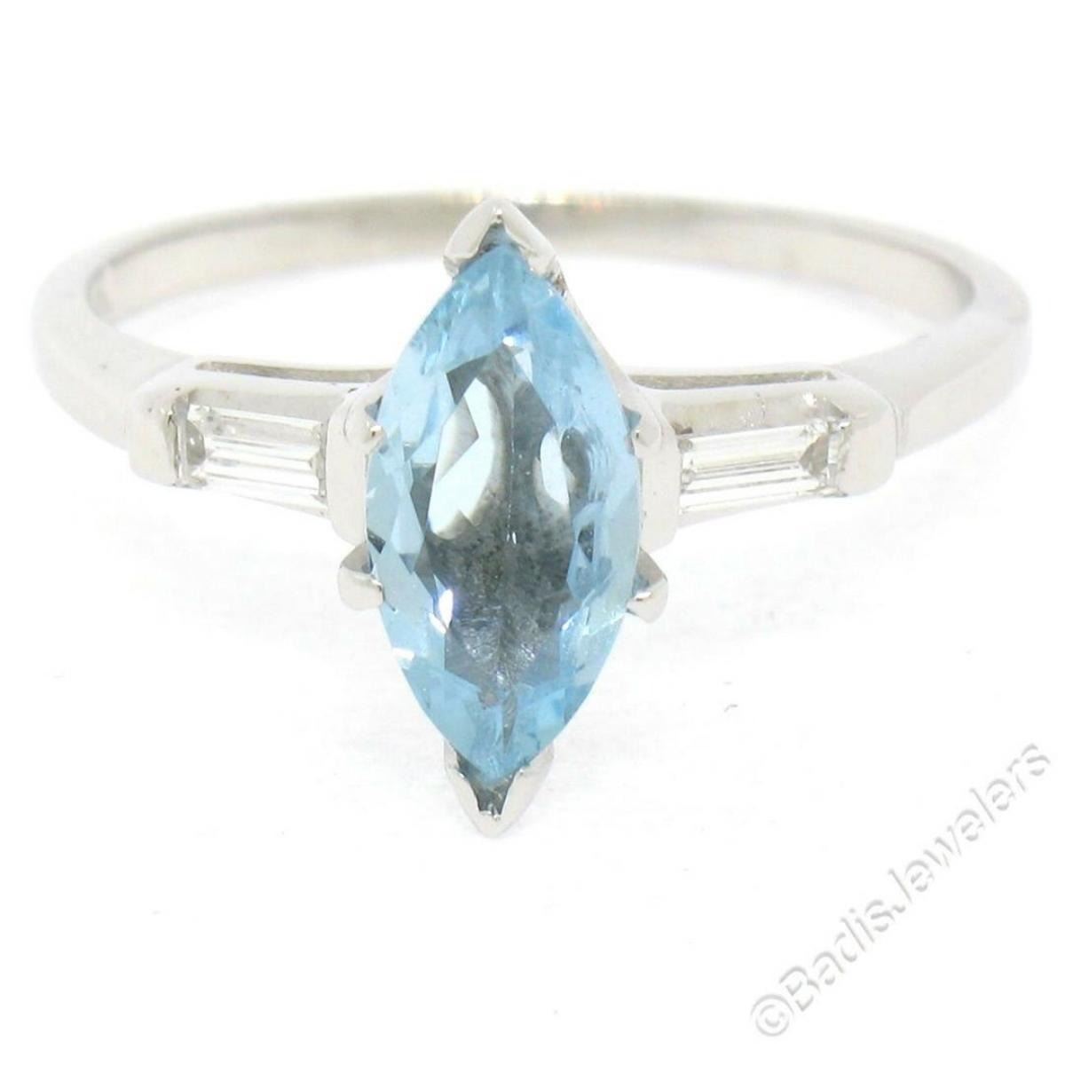 An excellent condition vintage 14kt white gold ring prong set with a 0.85ct marquise cut aquamarine accented with 0.38ctw of baguette cut diamonds (E - VVS2). The ring is size 6.5, weighs a total of 2.56 grams, and measures 12.0mm wide.