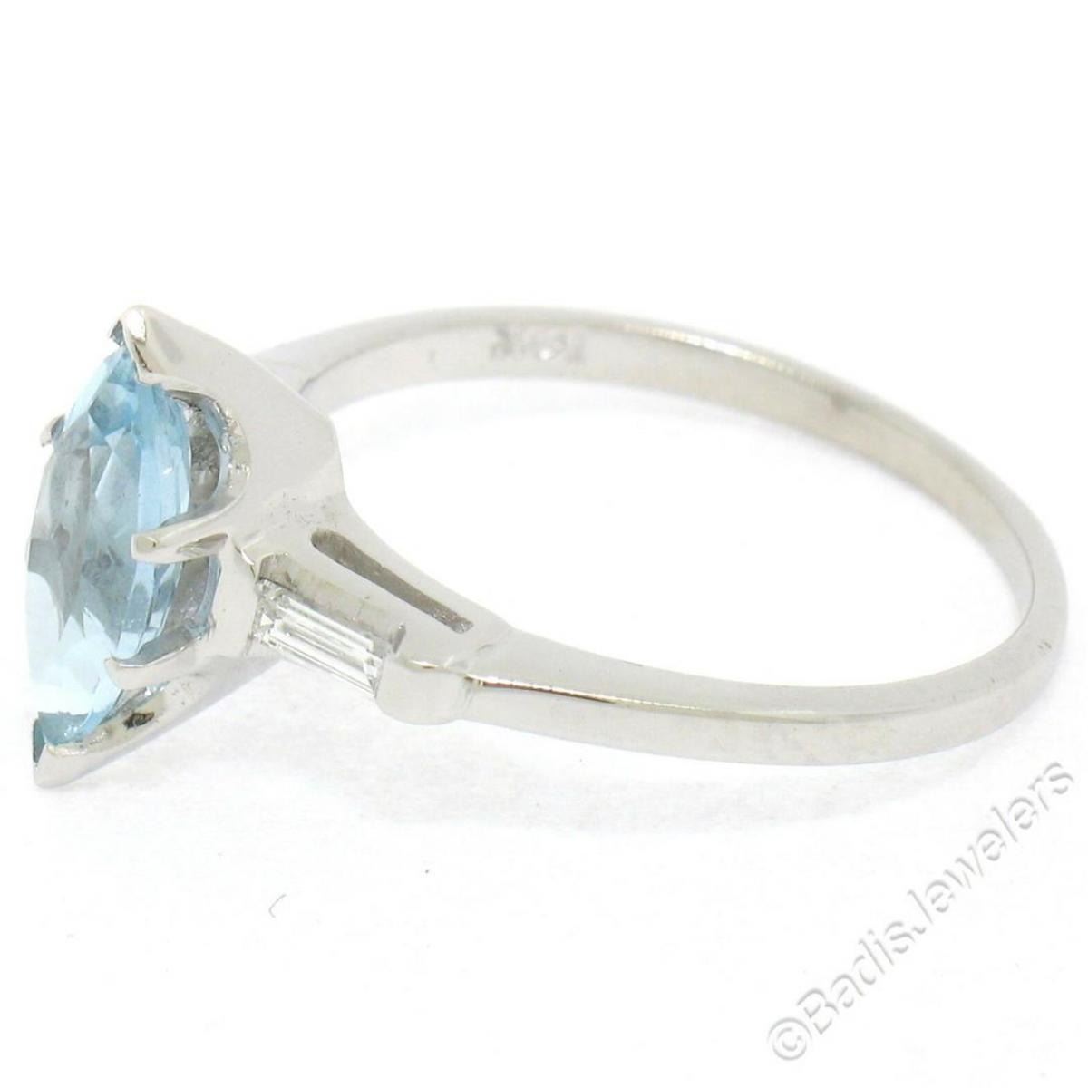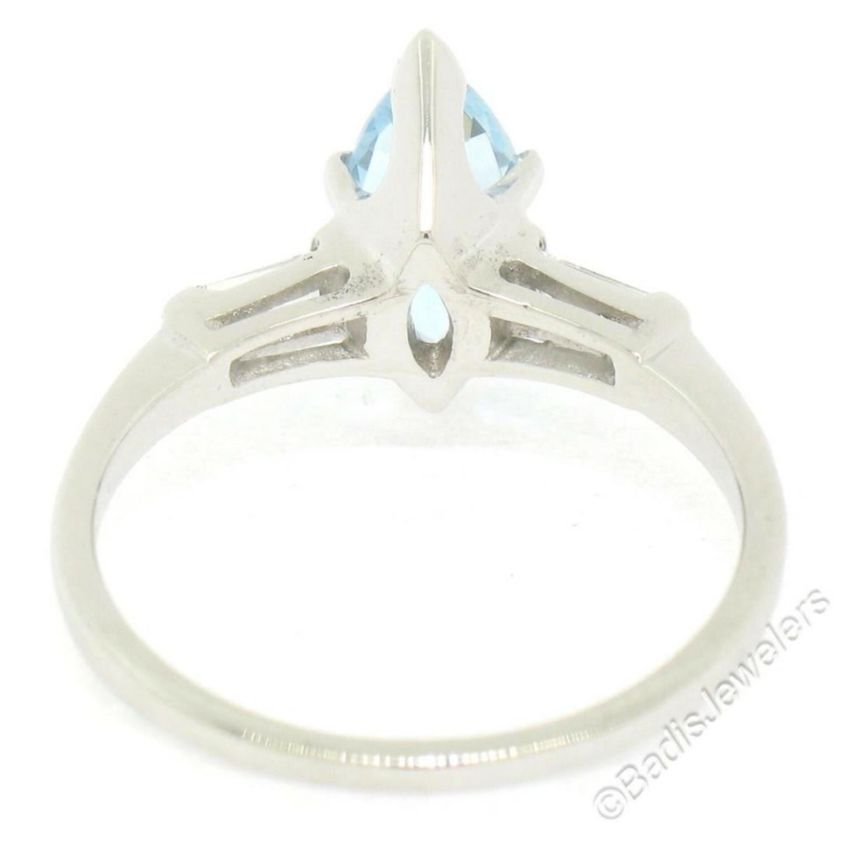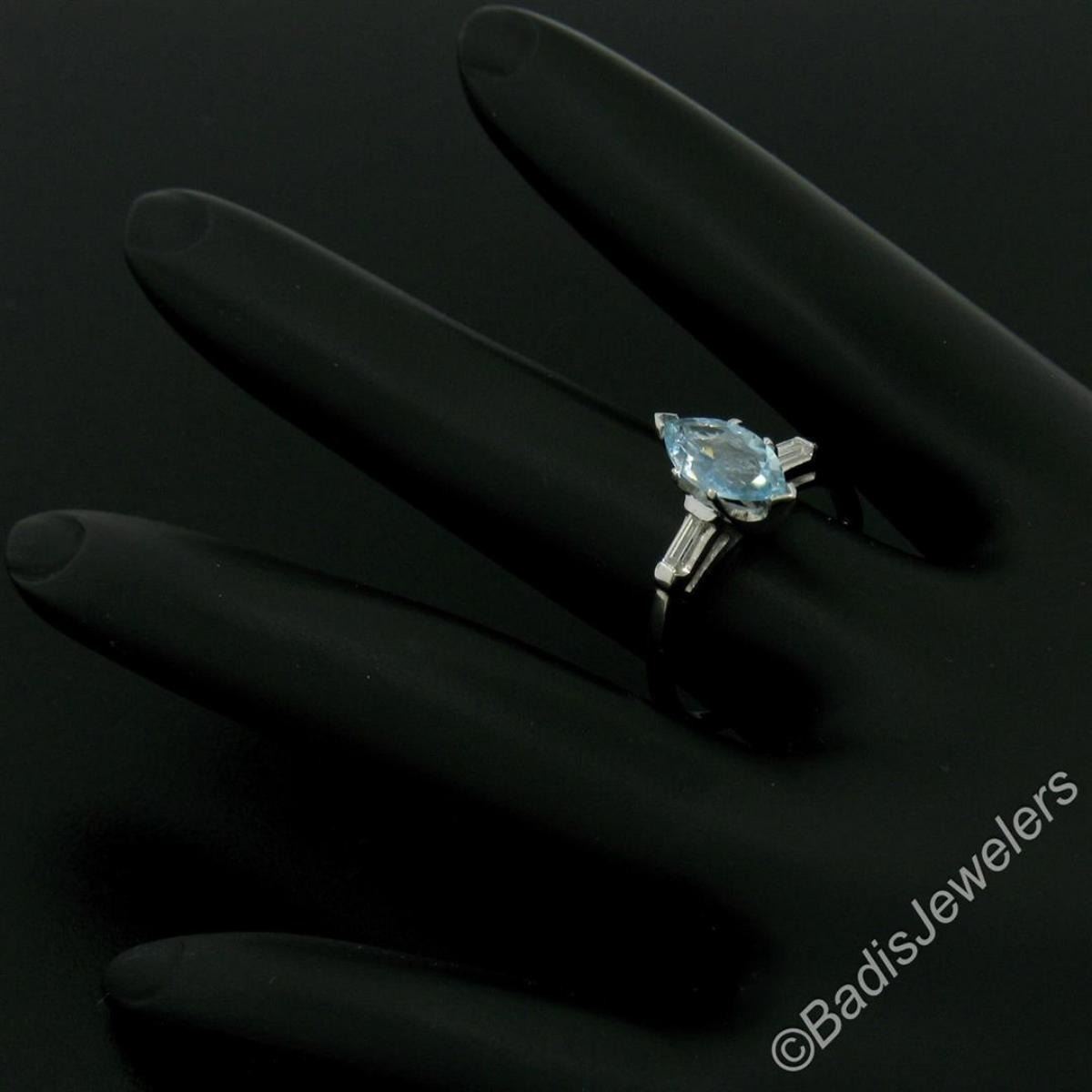 An excellent condition vintage 14kt white gold ring prong set with a 0.85ct marquise cut aquamarine accented with 0.38ctw of baguette cut diamonds (E - VVS2). The ring is size 6.5, weighs a total of 2.56 grams, and measures 12.0mm wide.