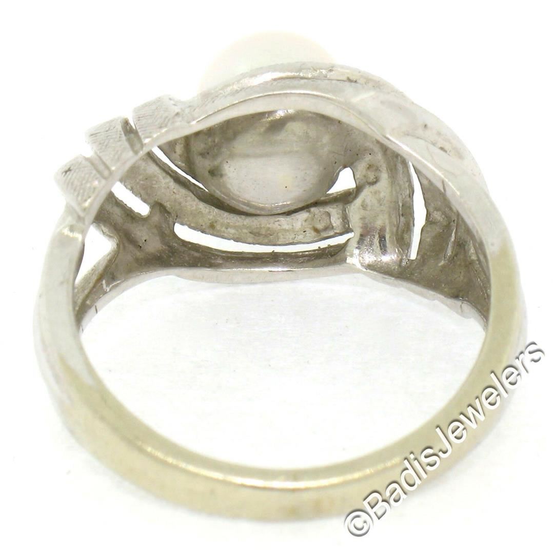 A vintage Florentine finished 14kt white gold ring with a 6.3mm round cultured pearl. The ring is size 4.5, weighs a total of 3.81 grams, and measures 11.05mm wide.
