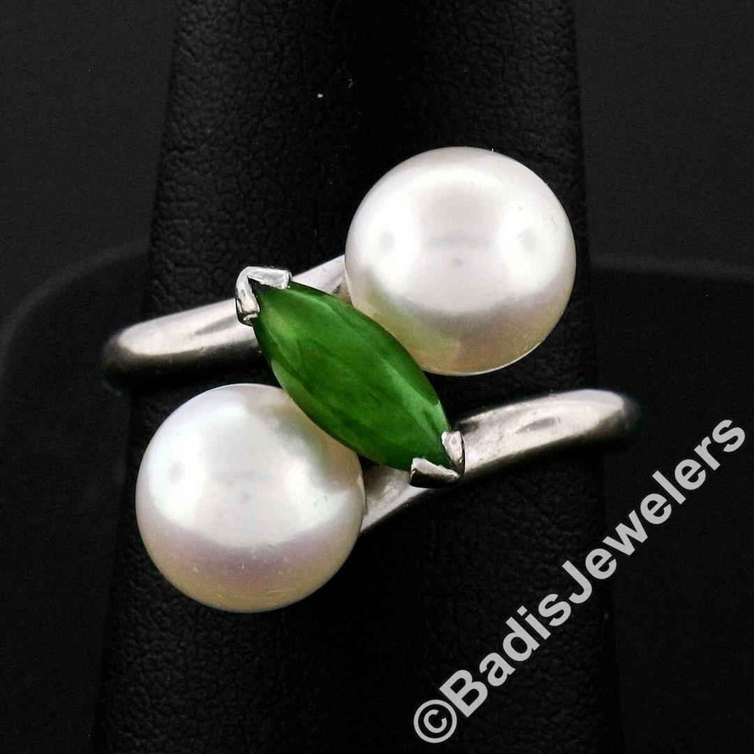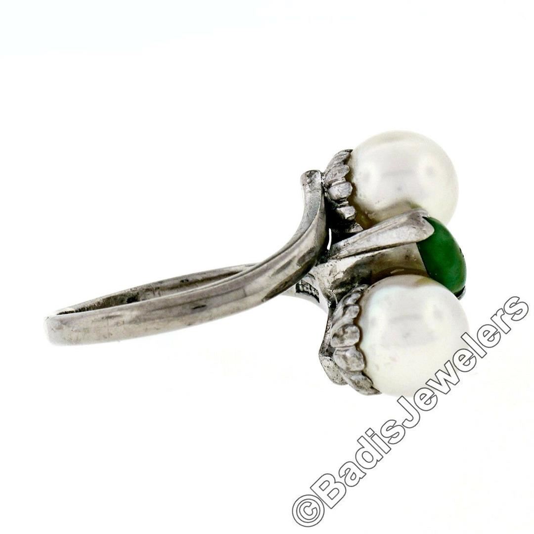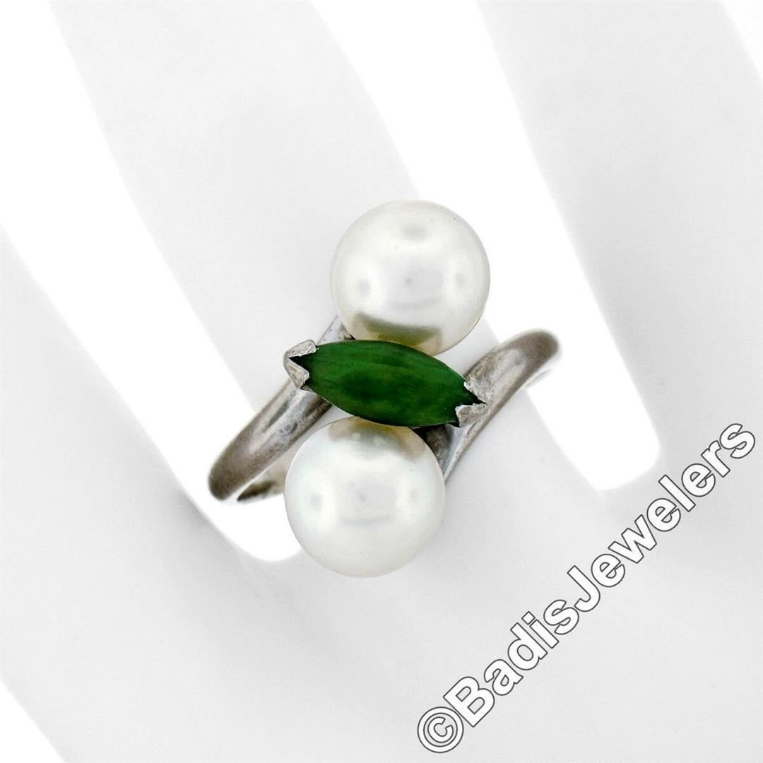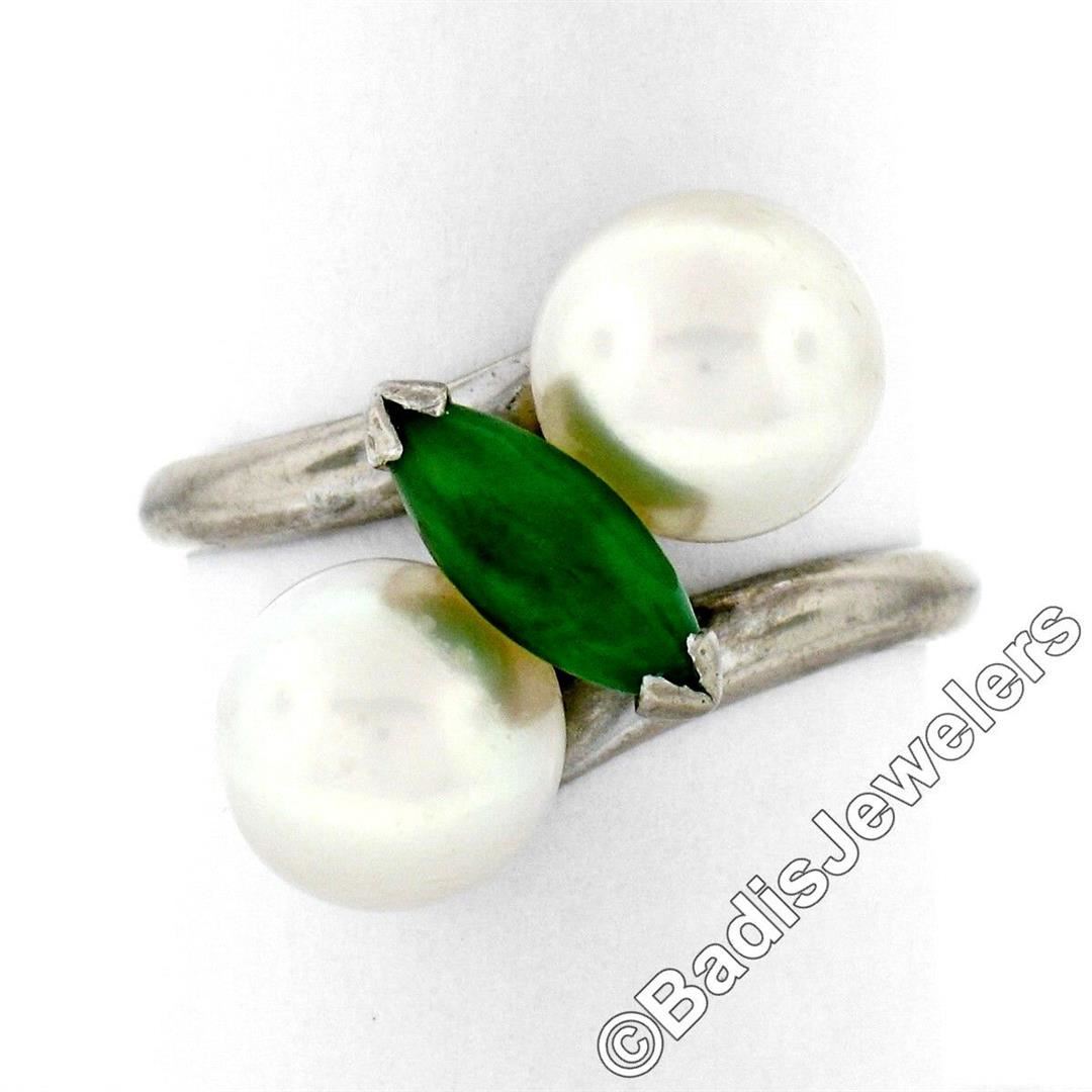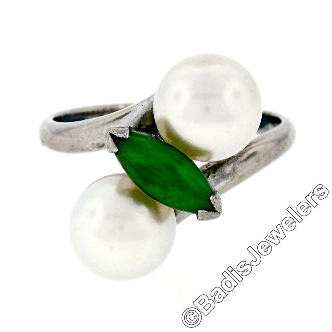 A vintage 14kt white gold bypass ring featuring a marquise cabochon cut jade (10.25x4.00mm) set between 2 round cultured pearls (8.35mm). The ring is size 8.5, weighs a total of 6.52 grams, and measures 17.5mm wide.
