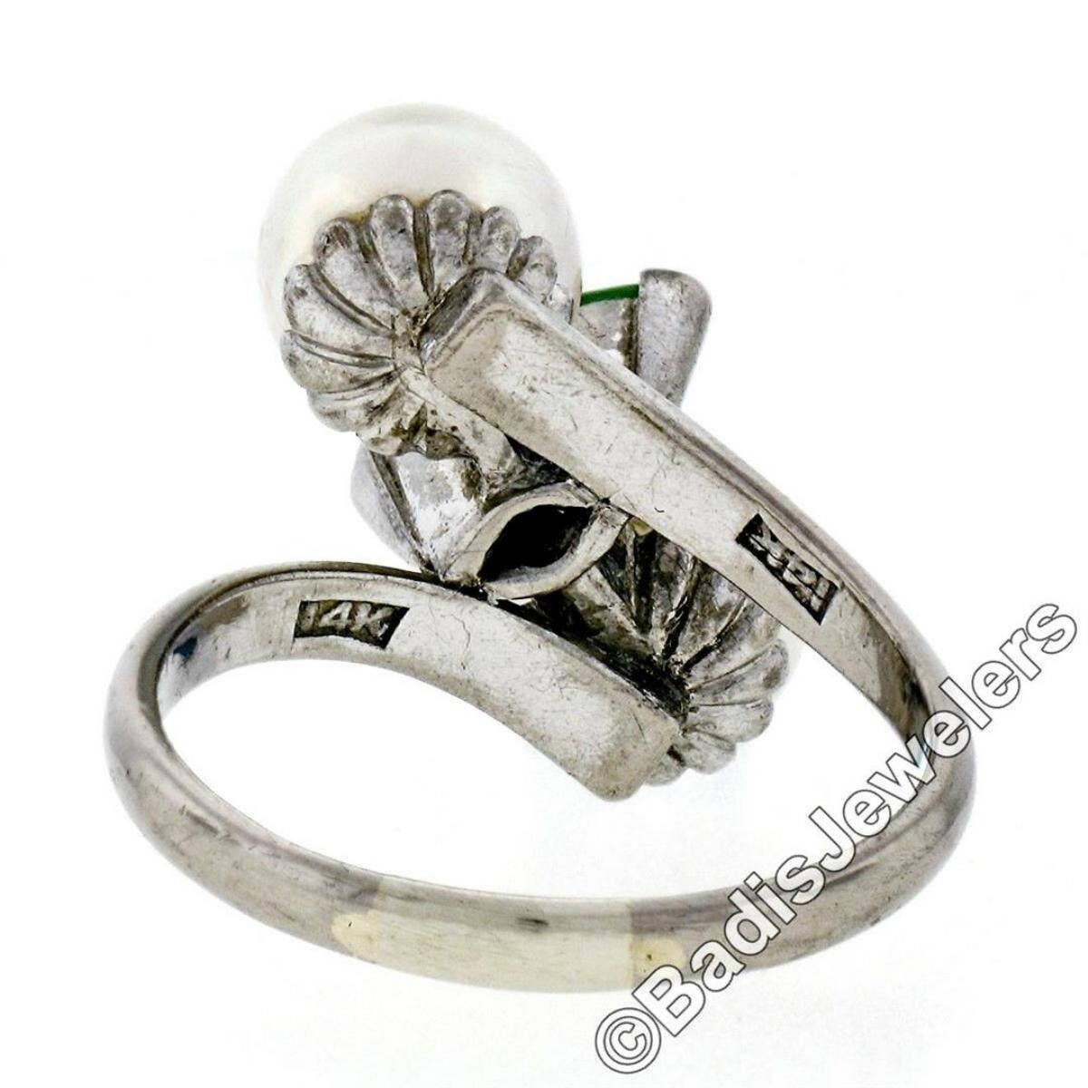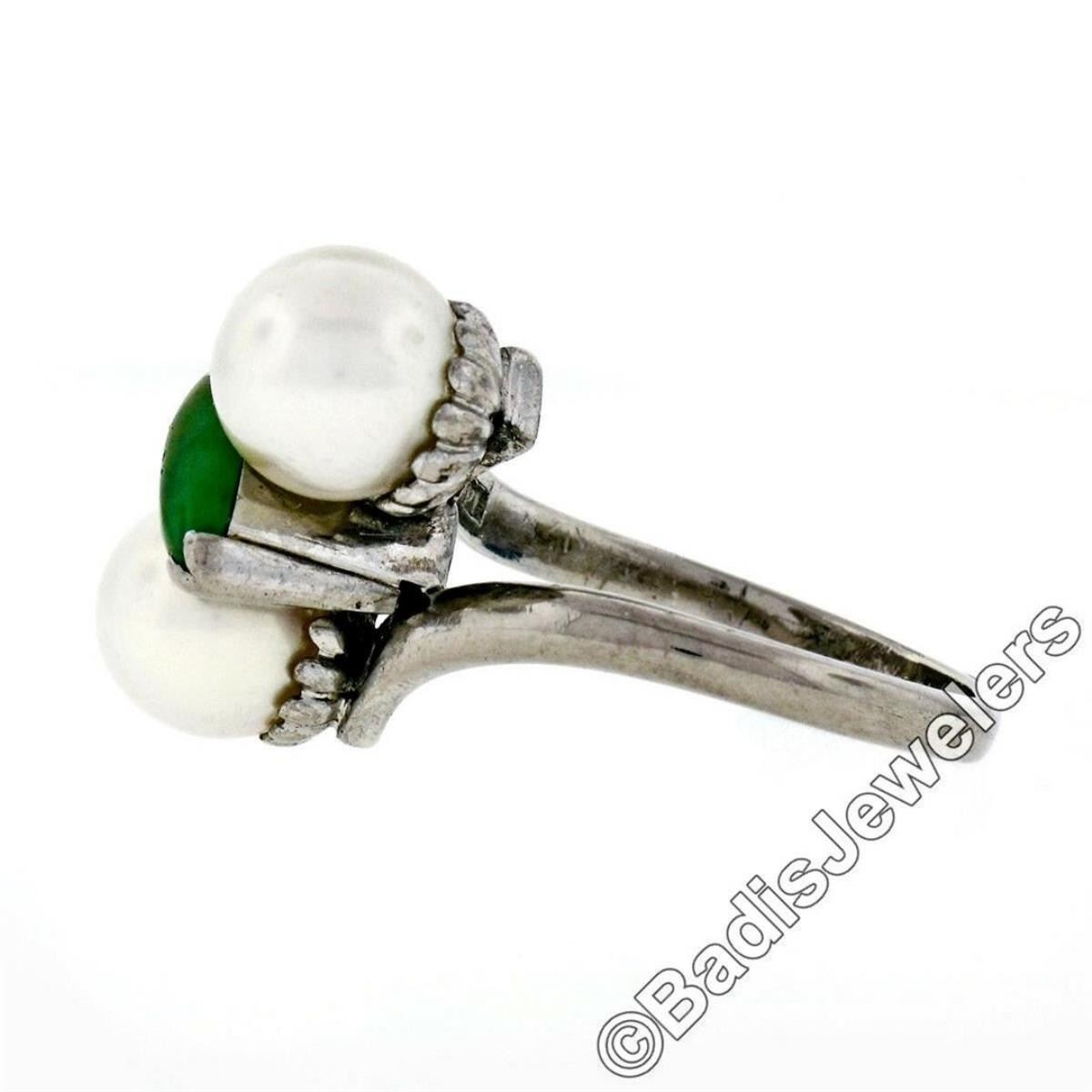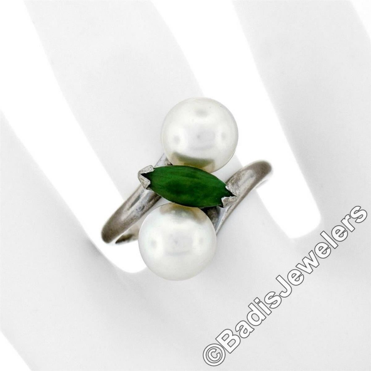 A vintage 14kt white gold bypass ring featuring a marquise cabochon cut jade (10.25x4.00mm) set between 2 round cultured pearls (8.35mm). The ring is size 8.5, weighs a total of 6.52 grams, and measures 17.5mm wide.