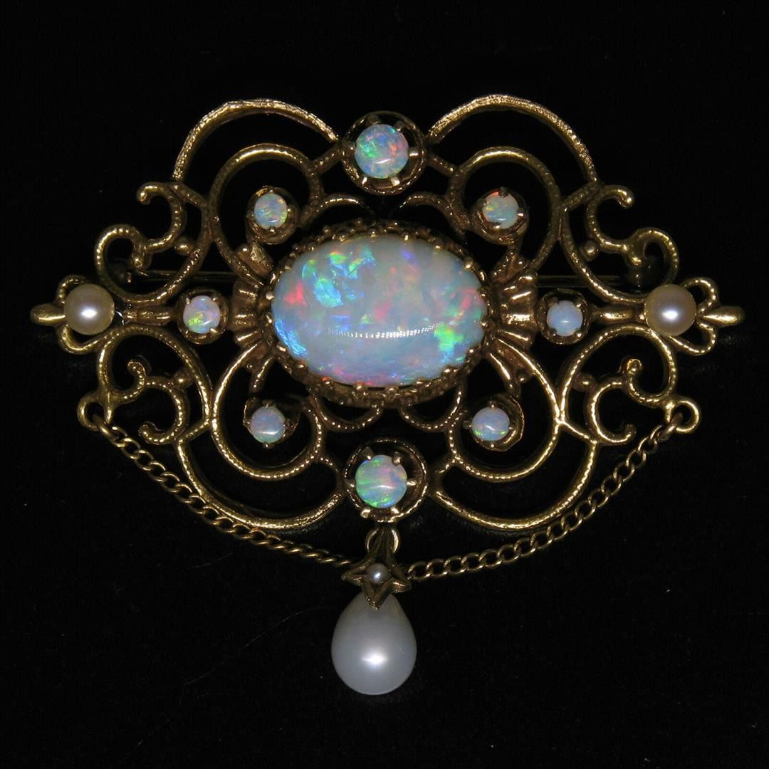An excellent condition vintage 14kt yellow gold brooch with 4.50 ctw of oval and round cabochon cut opals accented by 4 pearls. Measures 40.3x47.8mm and weighs a total of 11.3 grams.