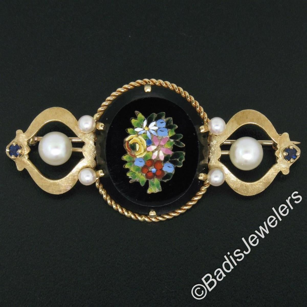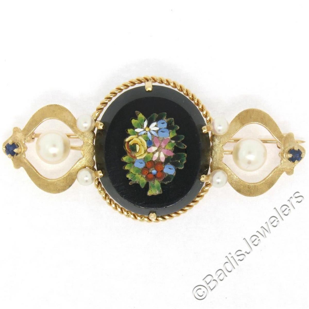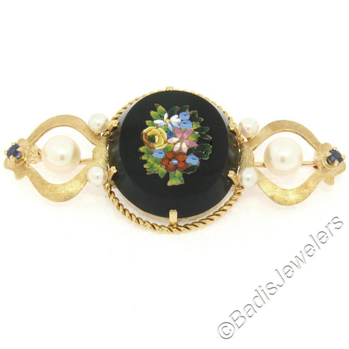 A vintage 14kt yellow gold brooch with a 22.75x20.20mm black onyx floral mosaic accented by 0.18ctw of round sapphires and and both 6.15mm and 3.20mm pearls. Measures 53.60x26.05mm and weighs a total of 9.24 grams.