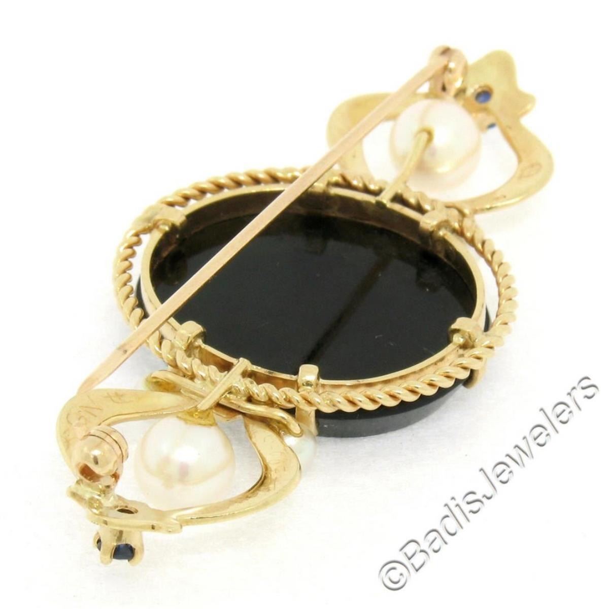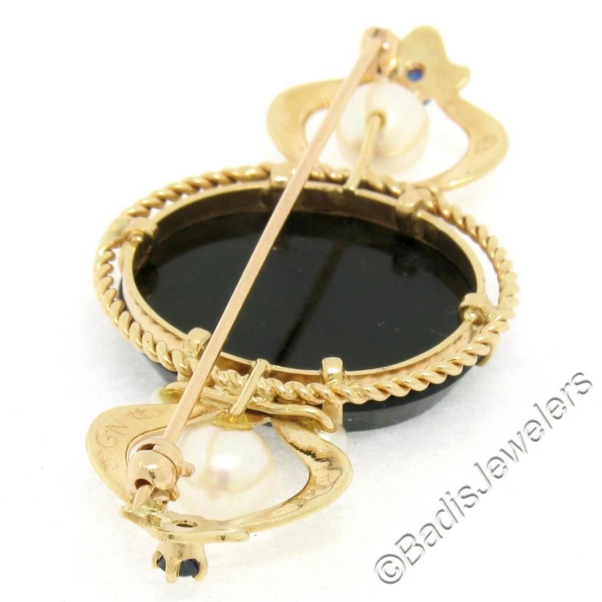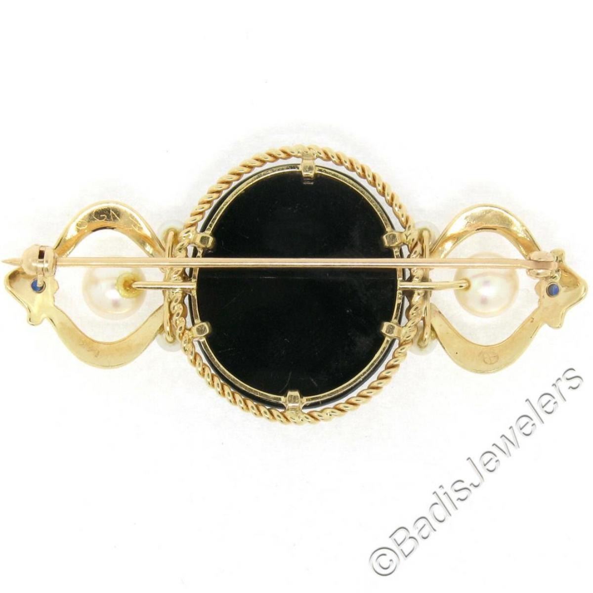 A vintage 14kt yellow gold brooch with a 22.75x20.20mm black onyx floral mosaic accented by 0.18ctw of round sapphires and and both 6.15mm and 3.20mm pearls. Measures 53.60x26.05mm and weighs a total of 9.24 grams.