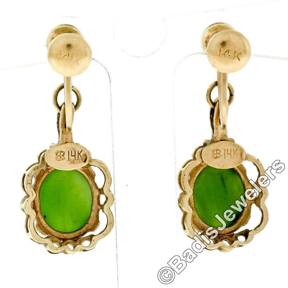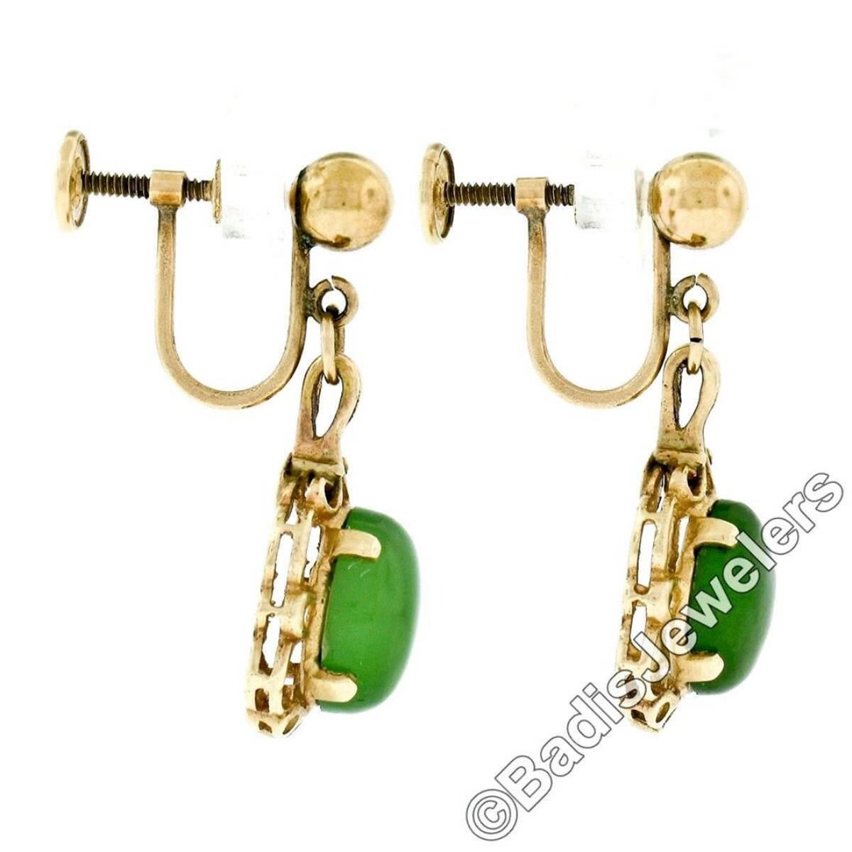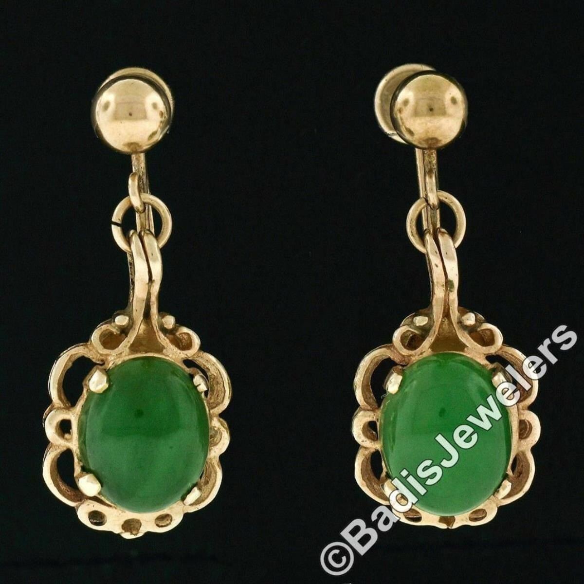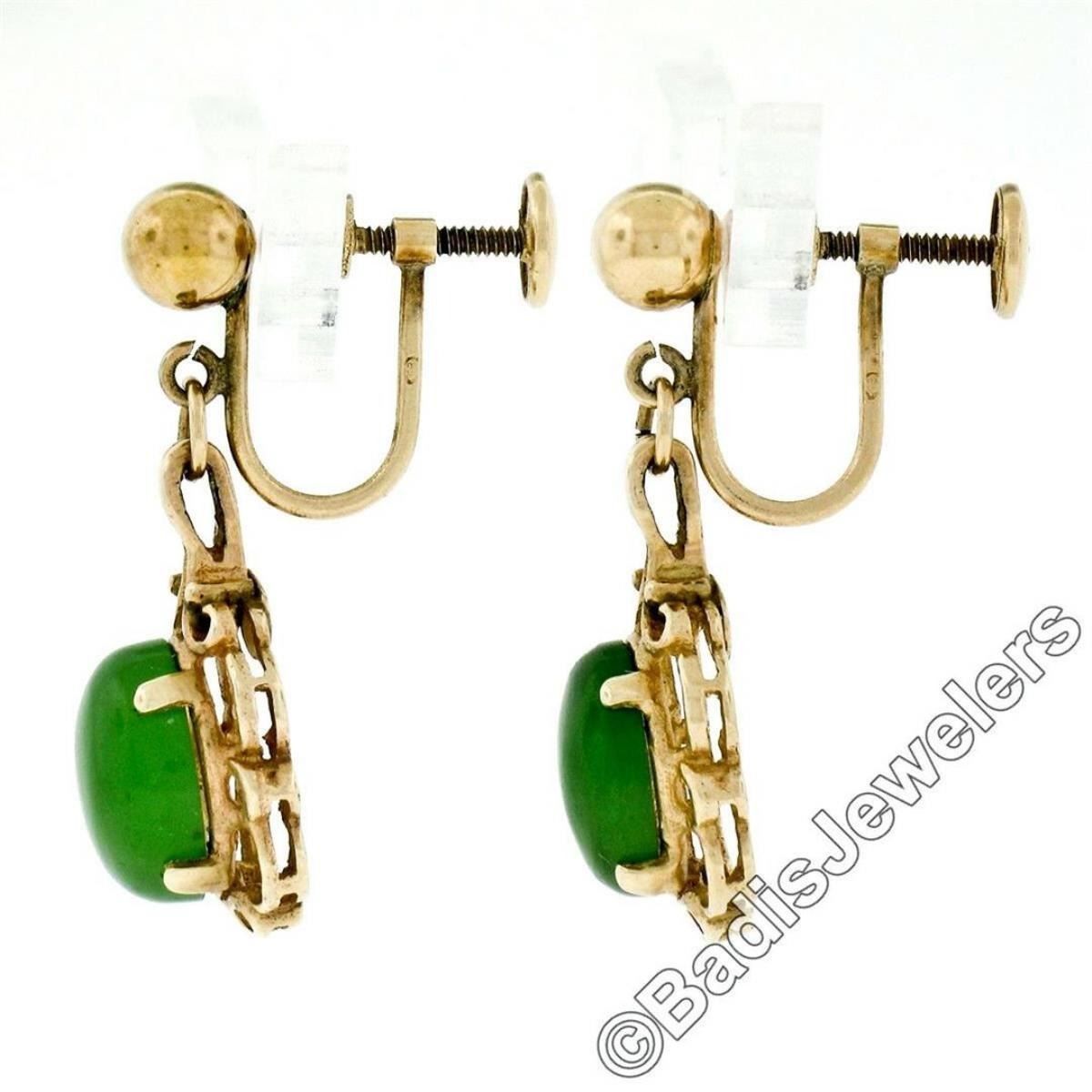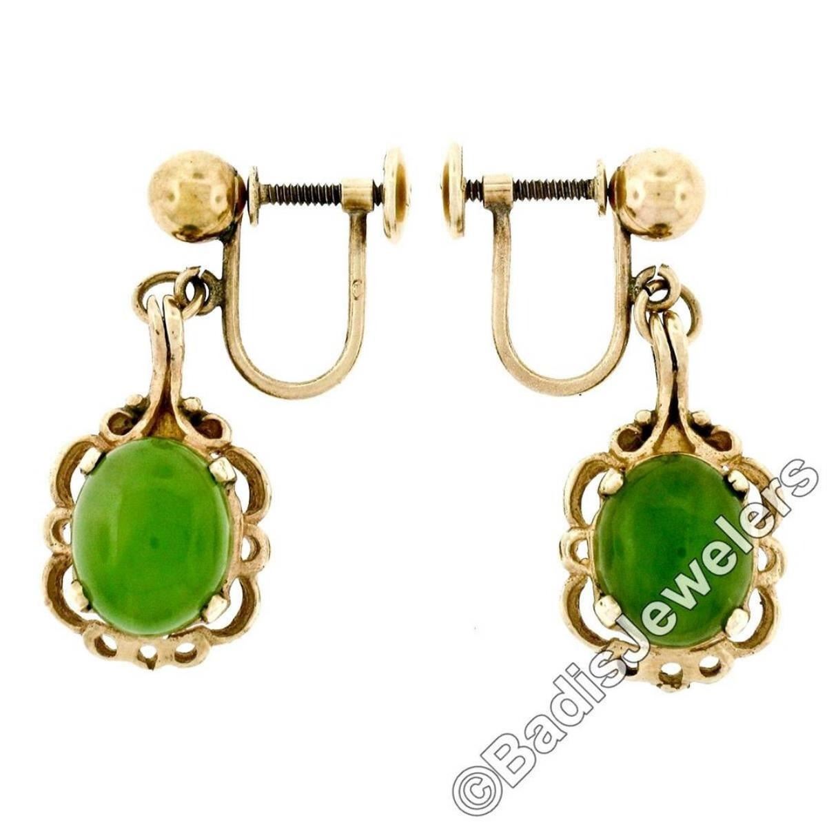 A vintage pair of dangle earring featuring a pair of oval cabochon cut green jades measuring approximately 9.7x8.0mm. The earrings measure approximately 28.5x11.6mm and weigh a total of 4.82 grams.