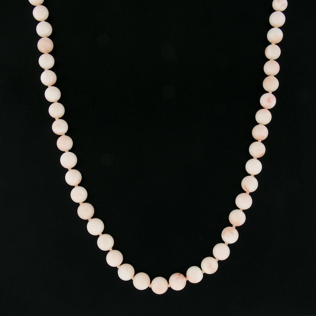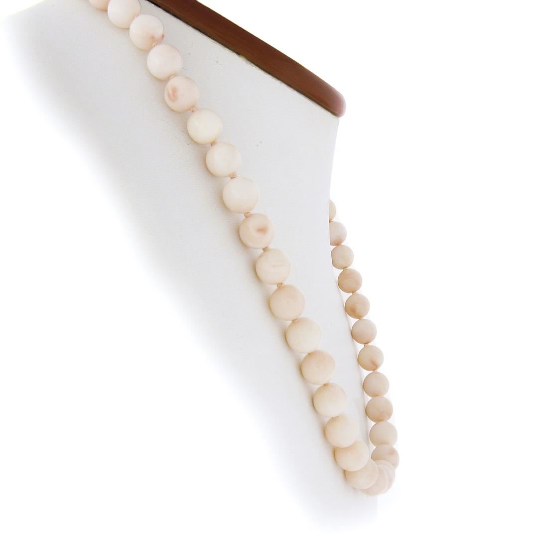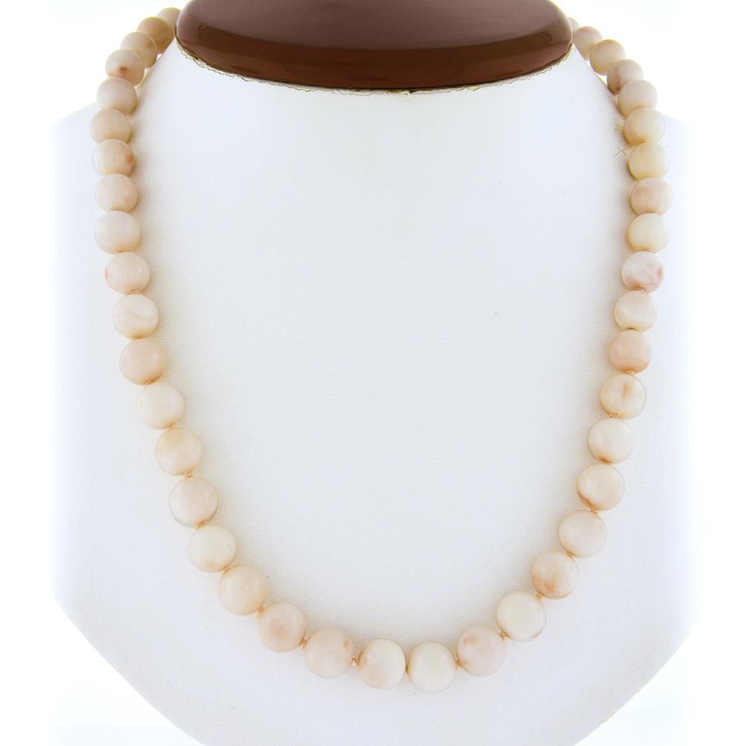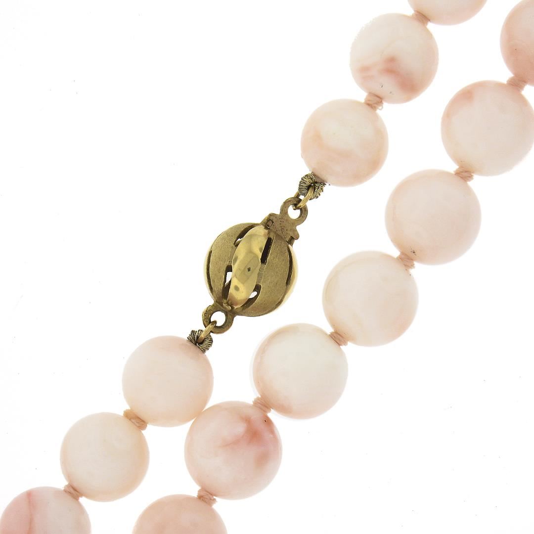 A vintage bead strand with 14k yellow gold clasp, featuring 50 round shape natural corals (8.5mm). It weighs a total of 40.69 grams, measures 8.5mm wide, and measures 16.5 inches in length.