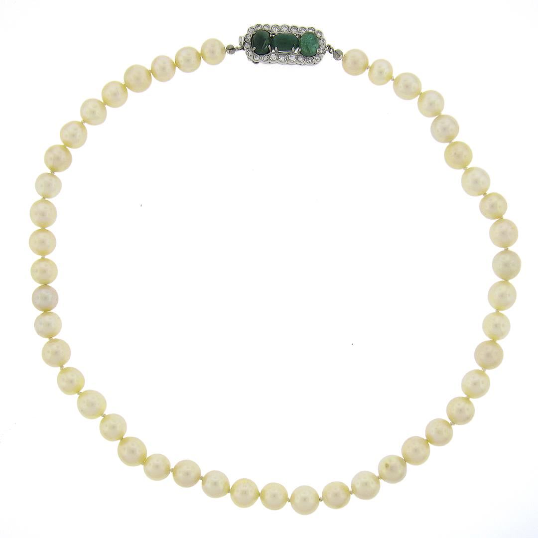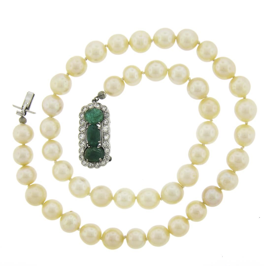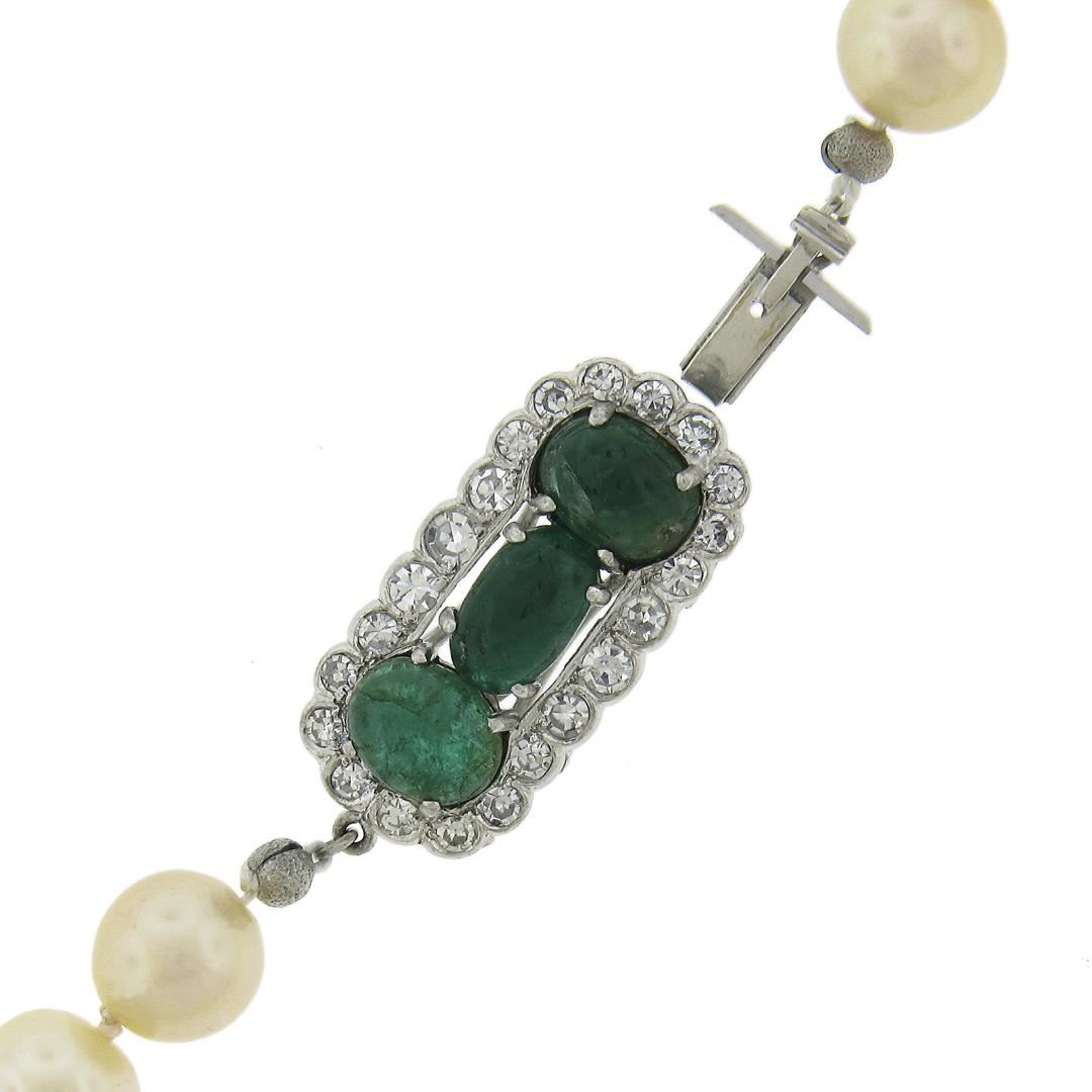 A vintage pearl strand necklace with 18k white gold clasp, featuring 45 round shape cultured pearls (8.85mm), 3 oval cabochon cut natural emeralds (8.3x5.3mm, 6.9x5mm & 7.8x5.9mm), and 22 old single cut natural diamonds (G-I - SI1-I1 ; 1.10ctw ). 17.5 inch pearl strand link chain, 44.32 grams total weight.
