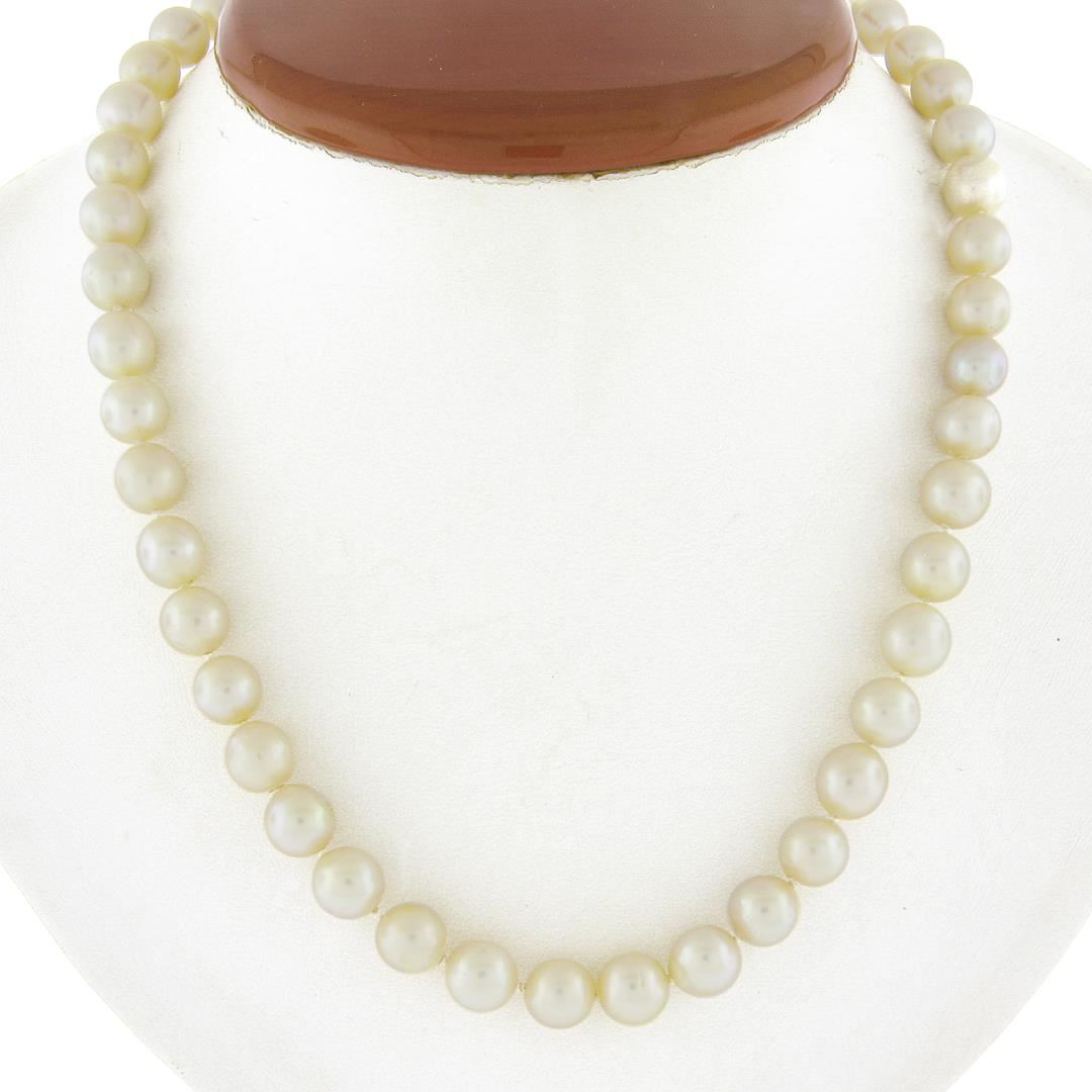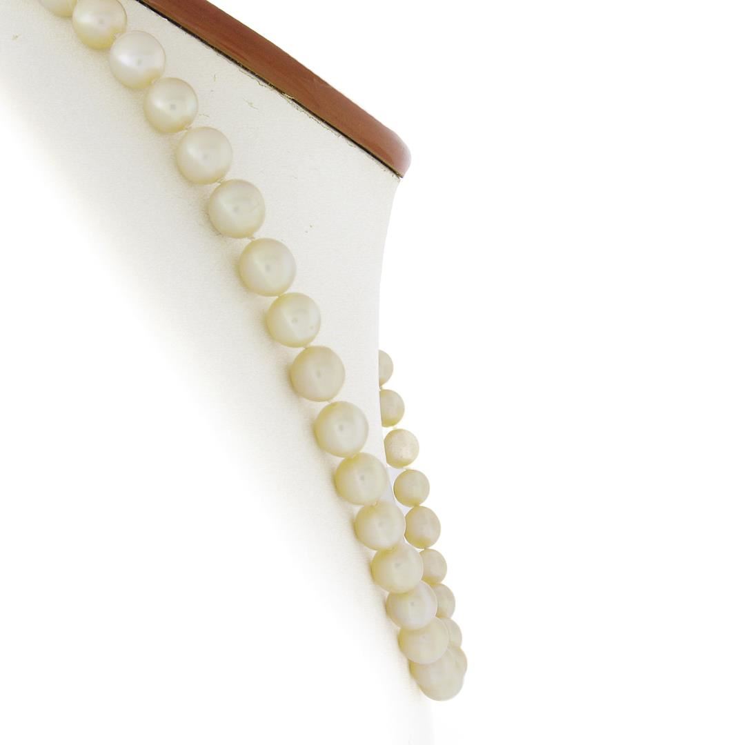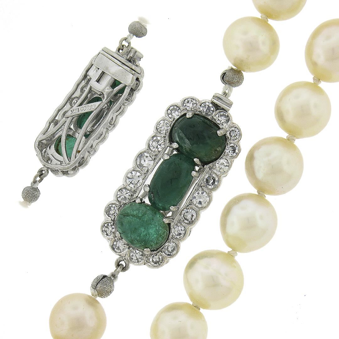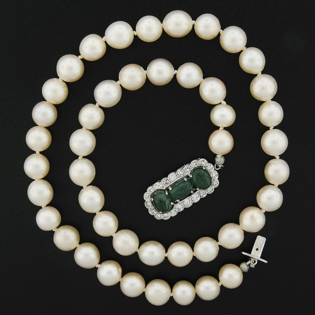 A vintage pearl strand necklace with 18k white gold clasp, featuring 45 round shape cultured pearls (8.85mm), 3 oval cabochon cut natural emeralds (8.3x5.3mm, 6.9x5mm & 7.8x5.9mm), and 22 old single cut natural diamonds (G-I - SI1-I1 ; 1.10ctw ). 17.5 inch pearl strand link chain, 44.32 grams total weight.