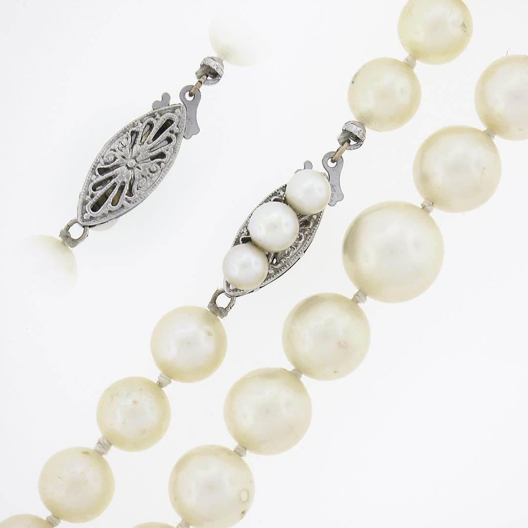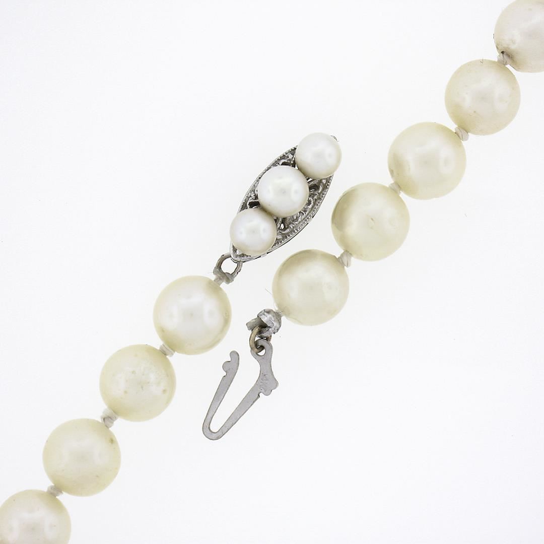 A vintage strand necklace with 14k white gold clasp, featuring 53 round shape cultured pearls (9.5mm to 7mm each), and 3 round shape cultured pearls on clasp (4.25mm to 4.7mm each). It weighs a total of 33.27 grams, measures 9.5mm wide, and measures 18 inches in length.