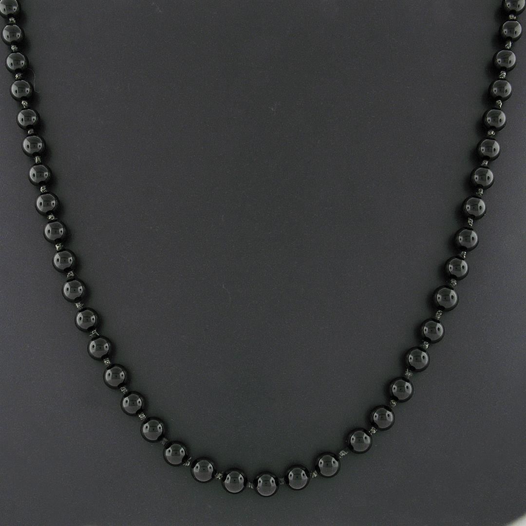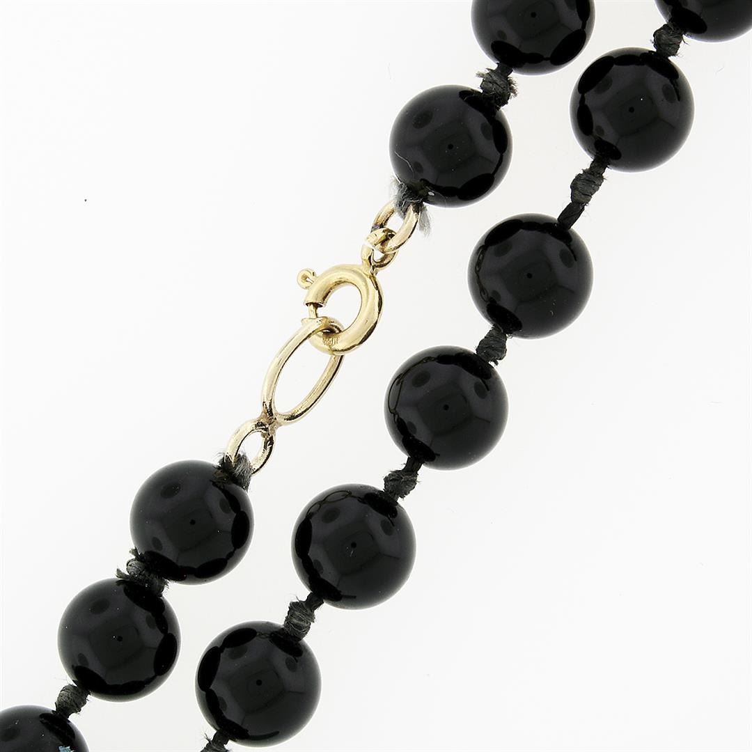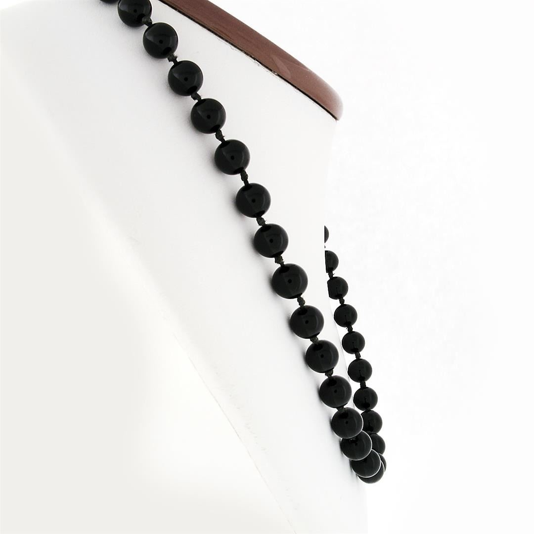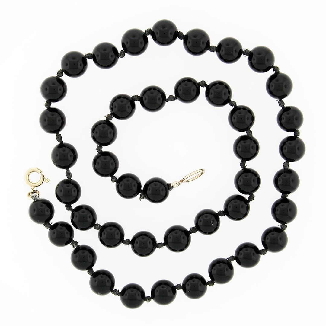 A vintage solid 14 yellow gold clasp on a strand necklace, with 43 round bead shape natural black onyx (7.75 to 8mm). 18 inch bead strand link chain, 28.66 grams total weight.