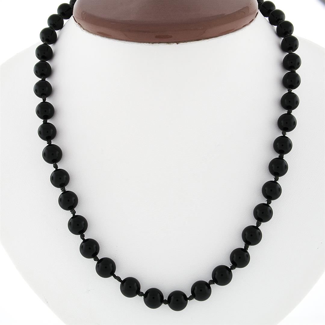 A vintage solid 14 yellow gold clasp on a strand necklace, with 43 round bead shape natural black onyx (7.75 to 8mm). 18 inch bead strand link chain, 28.66 grams total weight.