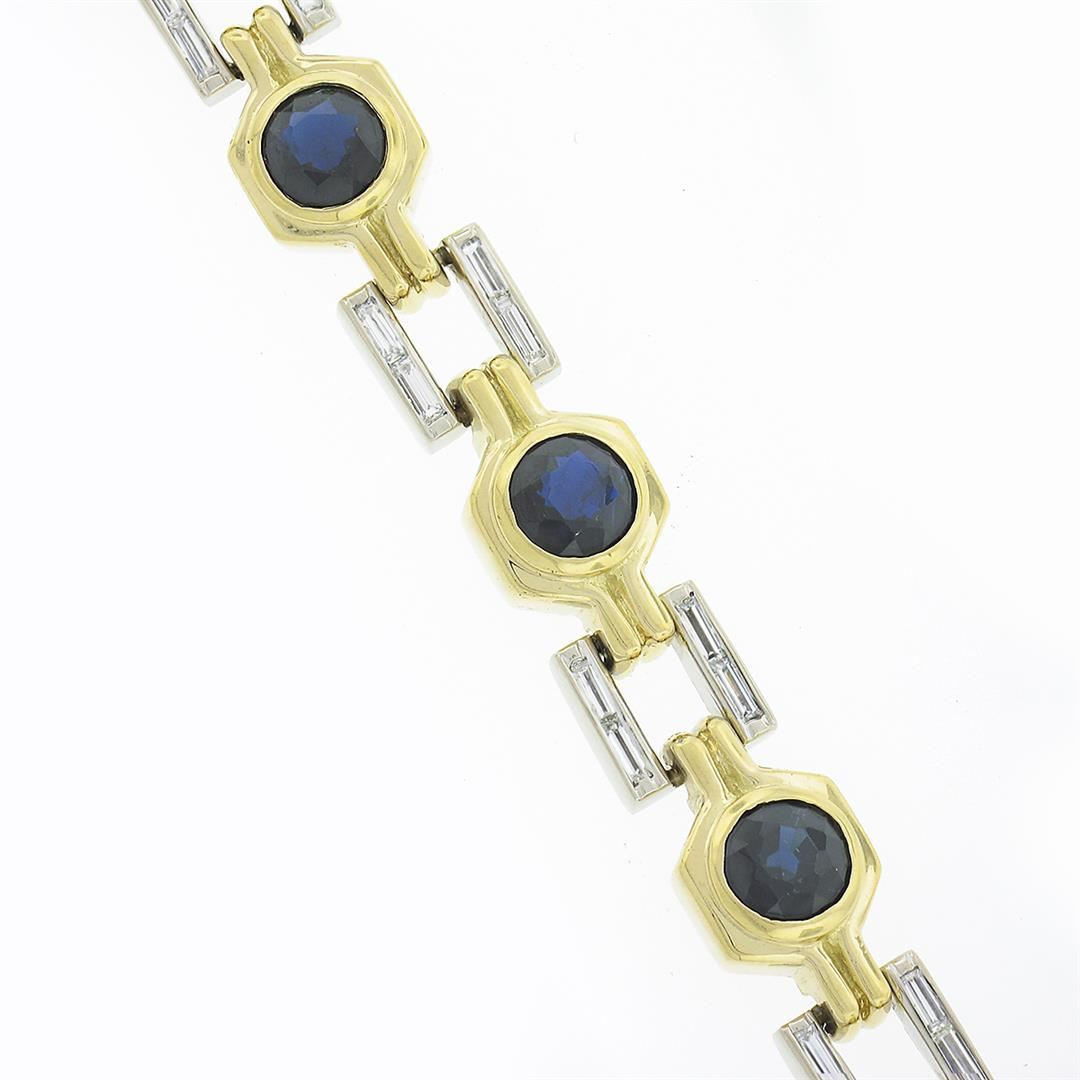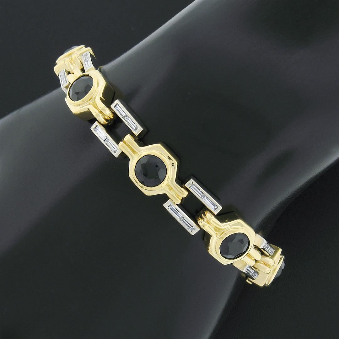 A solid 18k and 14k yellow & White gold link bracelet, with 7 round brilliant cut natural sapphires (6.2mm - 8.75ctw), and 32 straight baguette cut natural diamonds (G/H - VS1/VS2 ; 1.60ctw). It weighs a total of 36.15 grams, measures 9.20mm wide, and m