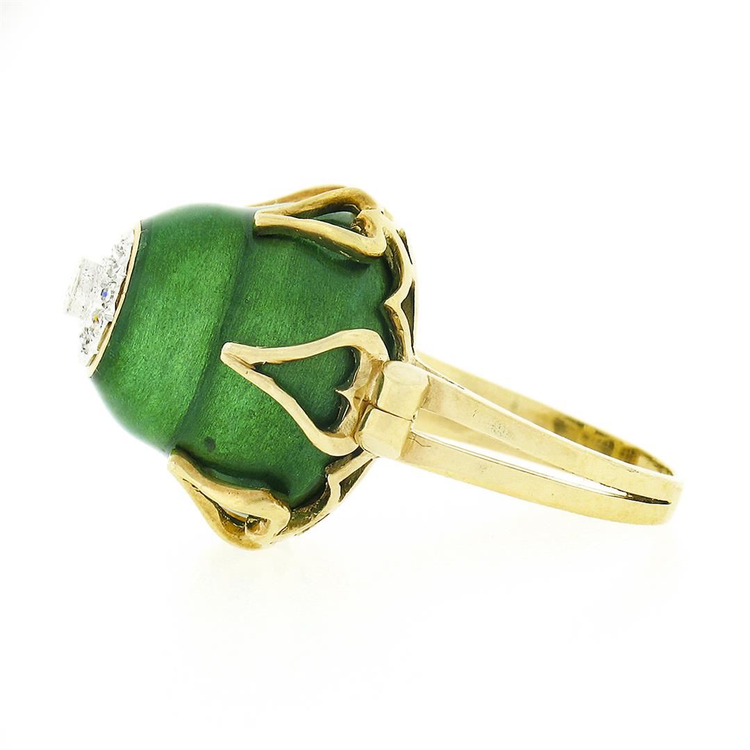 A solid 18k yellow gold statement tall ring, with 11 old single cut natural diamonds (G/H - VS1/VS2 ; 0.15ctw), and enamel work. The ring is size 5.0, weighs a total of 11.43 grams, and measures 17.60mm wide.