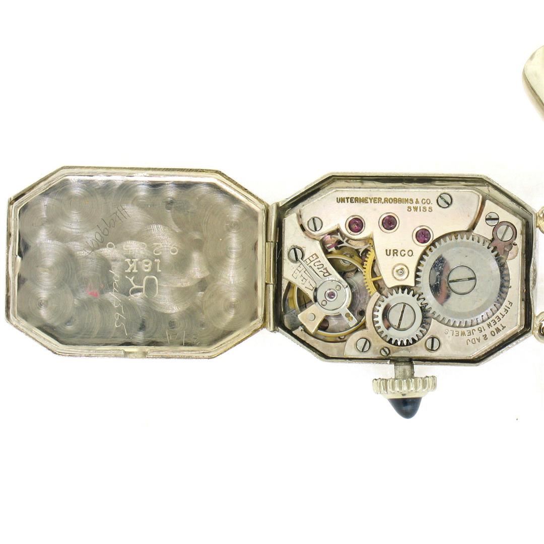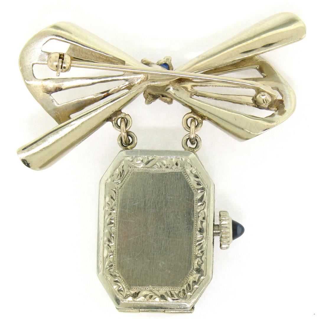 One Vintage 18K Gold 12pt Sapphire 15 Jewels Untermeyer Robbins Watch Bow Pin Brooch. Item Details: Material (Watch Case): Solid 18K White Gold, Material (Pin): Solid 14K White Gold, Total Weight: 15.6 Grams, Stones: (7) Natural Genuine Sapphires - Round Cut - Prong Set - Royal Blue Color - 0.12ctw (approx.), Movement: Swiss Made - Mechanical - Hand Winding - 15 Jewels - Adjusted for 2 Positions, Overall Height: 40.60mm, Overall Width: 39.40mm (pin), 19.73mm (watch), Overall Thickness: 6.78mm Clasp: Pin Back w/ Rotating Lock Condition: Vintage piece. Excellent physical and running condition!