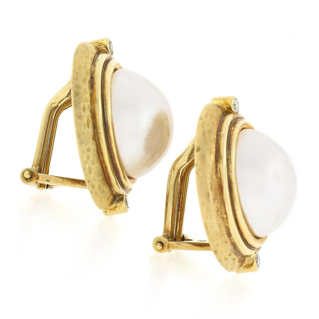 A vintage solid 18k yellow gold button earrings, with 2 round shape Mabe pearls (13.1mm each), and 4 round brilliant cut natural diamonds (G/H - VS1/VS2 ; 0.10ctw). The earrings measure approximately21.20x20.70mm and weigh a total of 15.47grams.