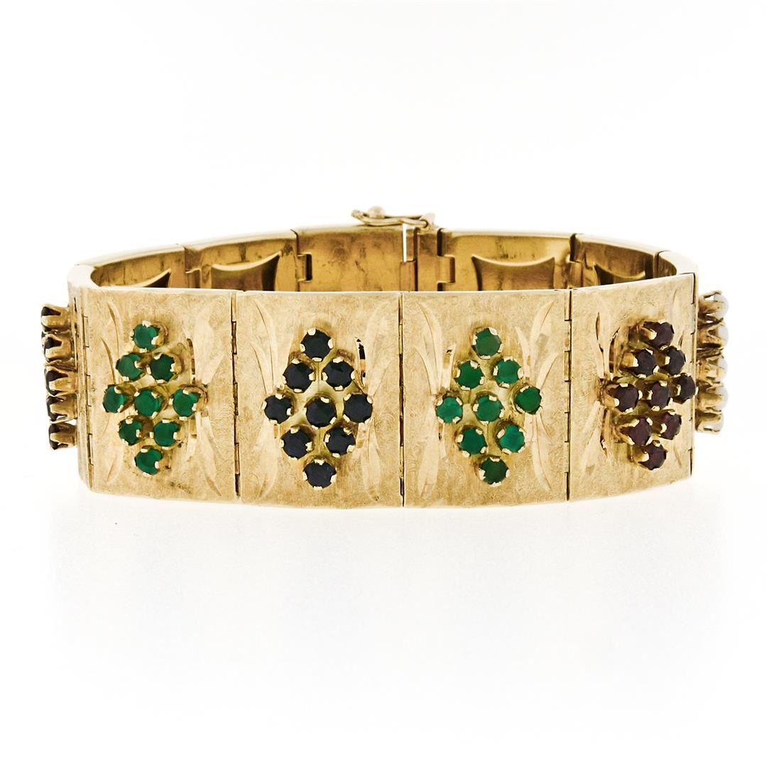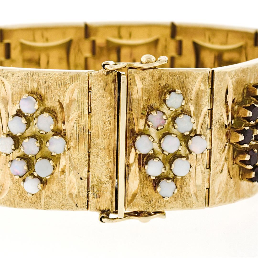 A vinateg solid 18k yellow gold wide bracelet, with 36 round cabochon cut natural opals (2.9mm - 3.0mm), and 36 round cut natural garnets (3.0mm - 4.68ctw), with 18 round cut natural emeralds (3.0mm - 2.16ctw), and 9 round cut natural sapphires ( 3.0mm - 4.5ctw). It weighs a total of 75.72 grams, measures 23.1mm wide, and measures 7 inches in length.