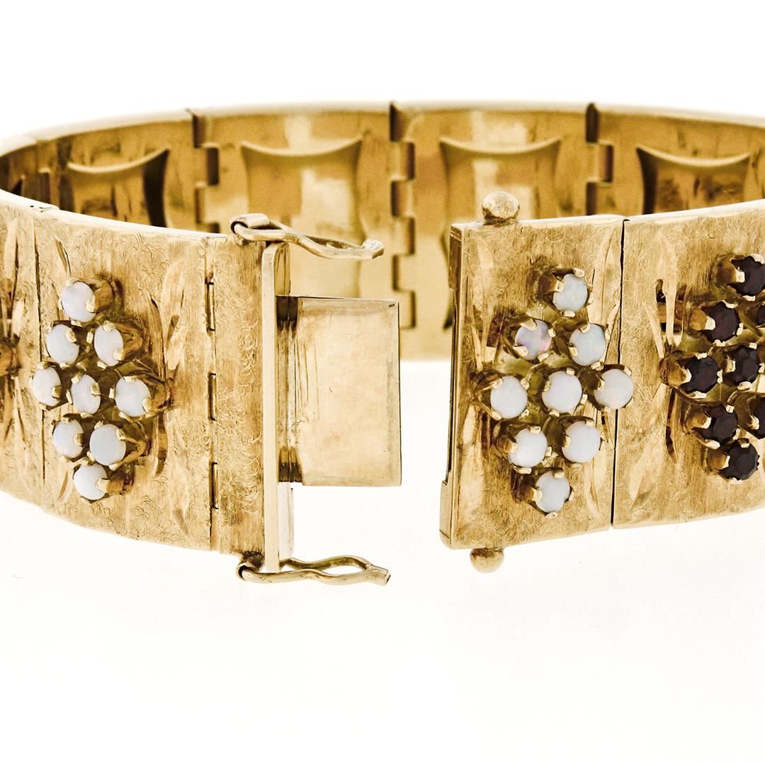 A vinateg solid 18k yellow gold wide bracelet, with 36 round cabochon cut natural opals (2.9mm - 3.0mm), and 36 round cut natural garnets (3.0mm - 4.68ctw), with 18 round cut natural emeralds (3.0mm - 2.16ctw), and 9 round cut natural sapphires ( 3.0mm - 4.5ctw). It weighs a total of 75.72 grams, measures 23.1mm wide, and measures 7 inches in length.