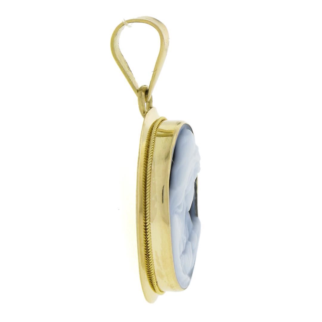 A vintage solid 18k yellow gold pendant, with oval shape carved cameo hardstone (15.6x11.4mm). The pendant weighs a total of 1.69 grams, measures 27.5x15mm including the bail, and the inside of the bail measures 5.7x4.3mm.