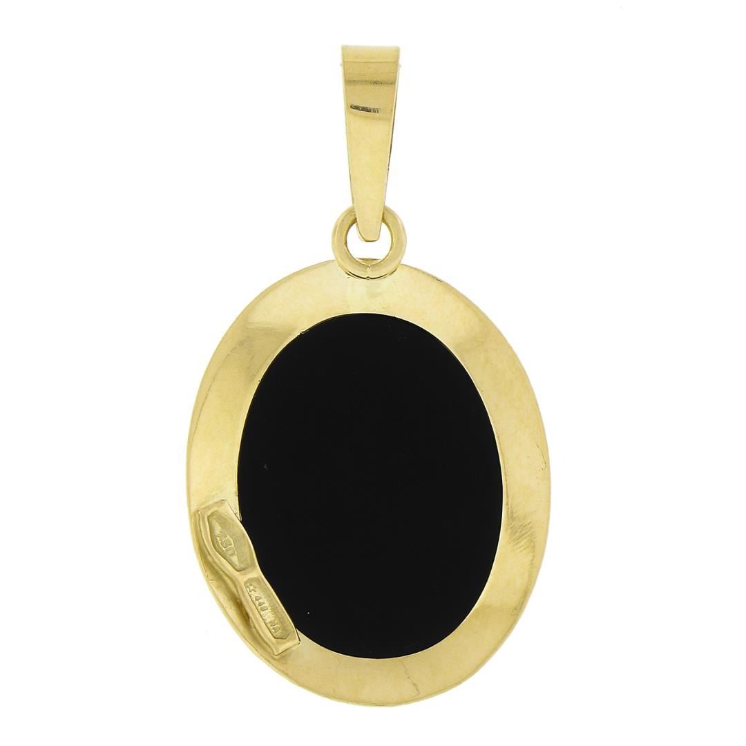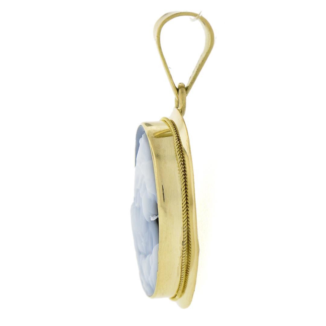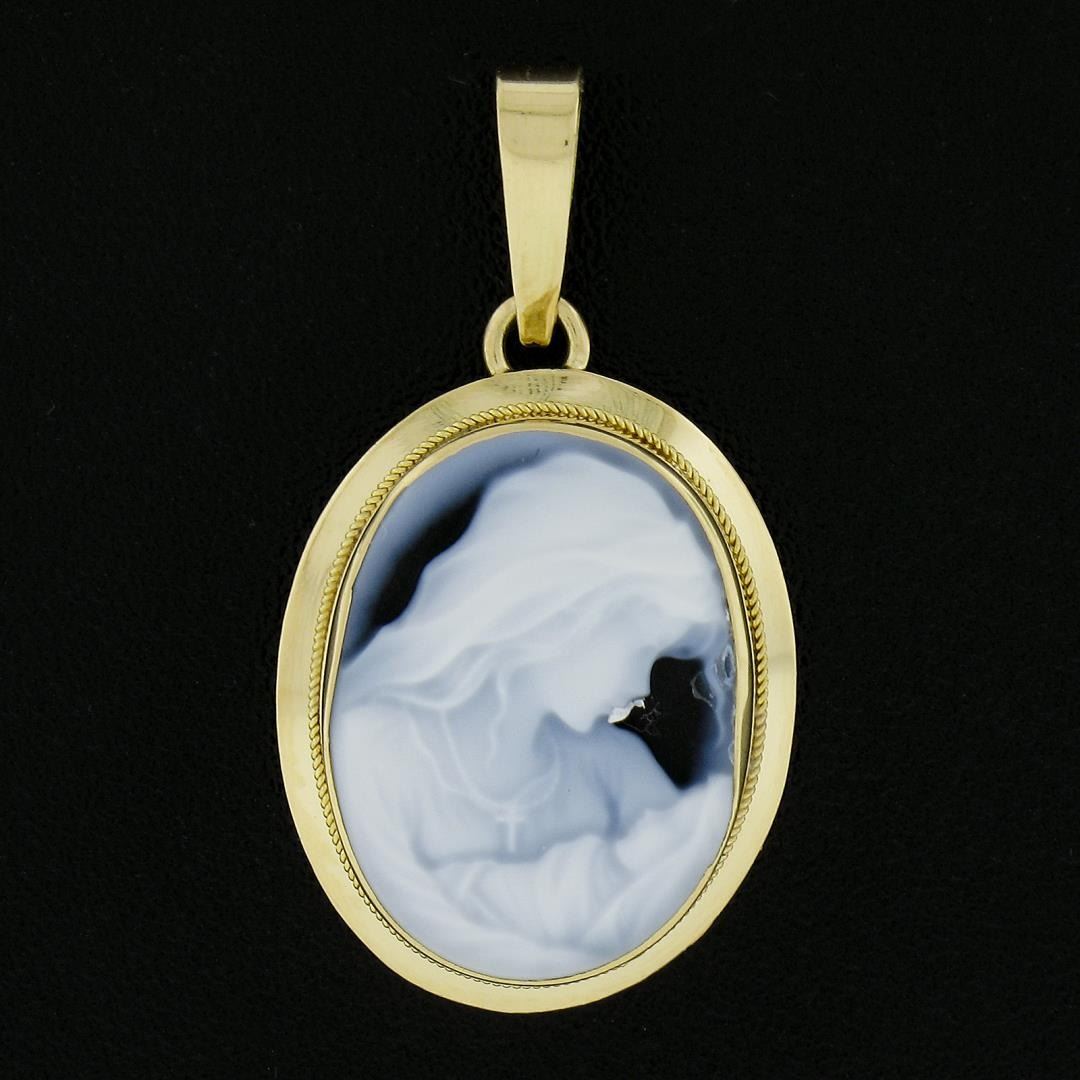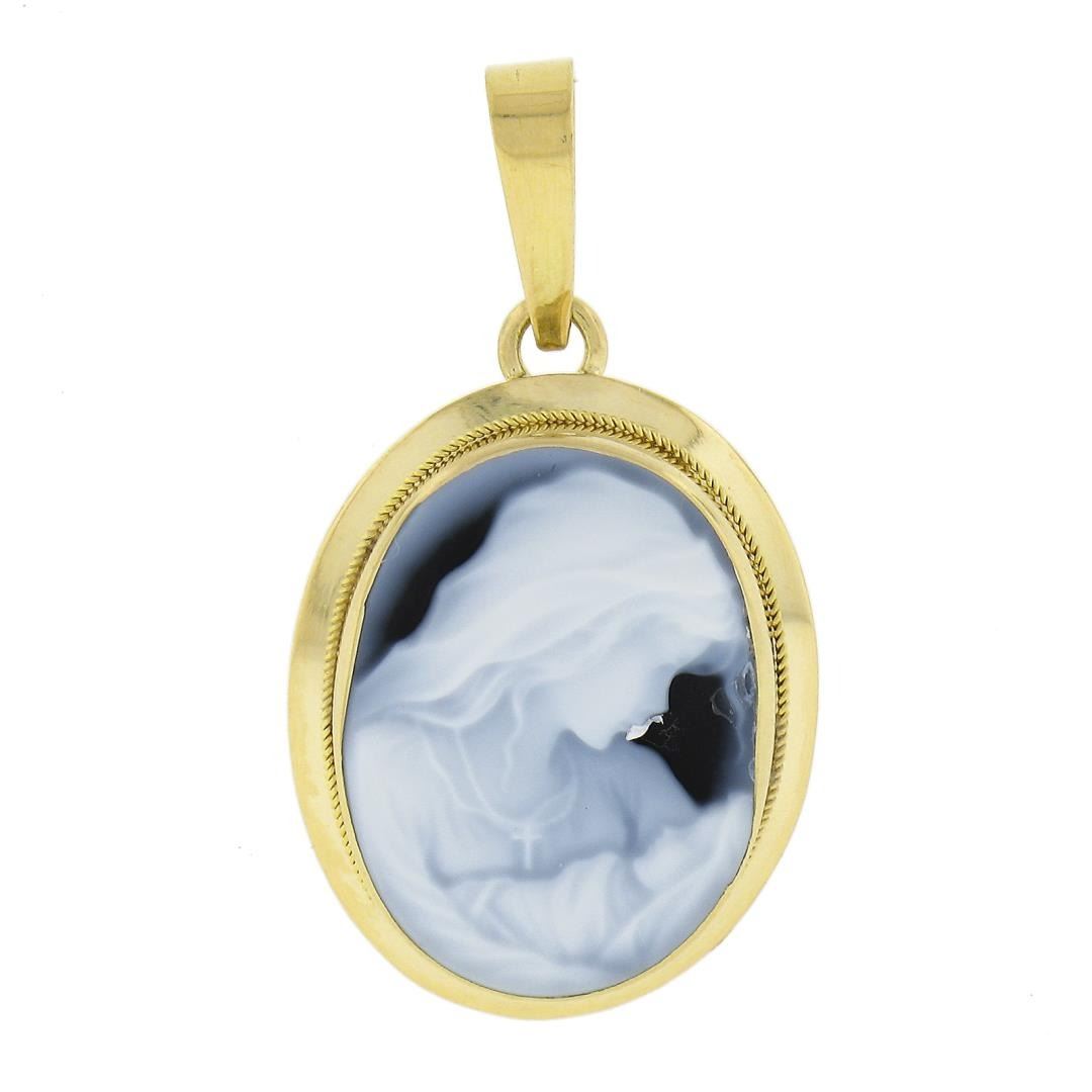 A vintage solid 18k yellow gold pendant, with oval shape carved cameo hardstone (15.6x11.4mm). The pendant weighs a total of 1.69 grams, measures 27.5x15mm including the bail, and the inside of the bail measures 5.7x4.3mm.