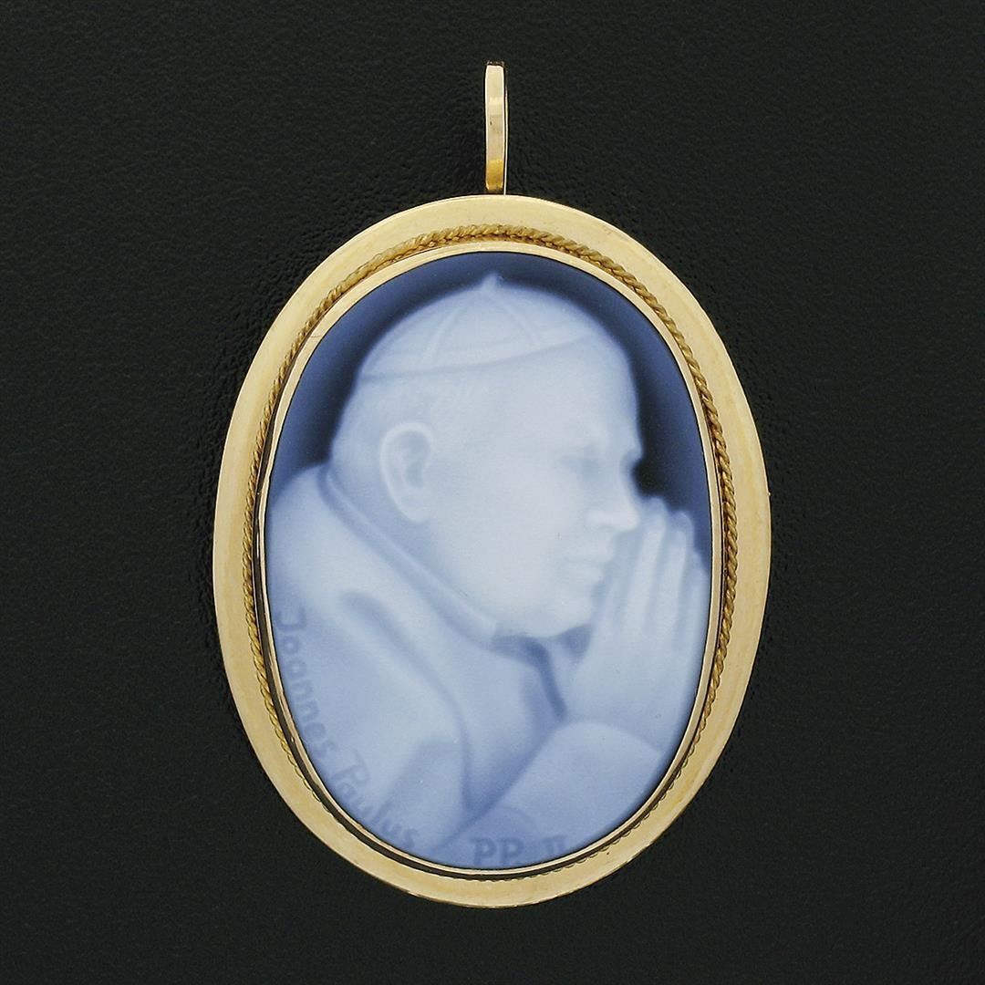 A vintage solid 18k yellow gold pin brooch pendant, with 1 oval shape carved cameo hardstone (24.6x17.5mm). Measures 28.6x22mm and weighs a total of 4.47 grams.