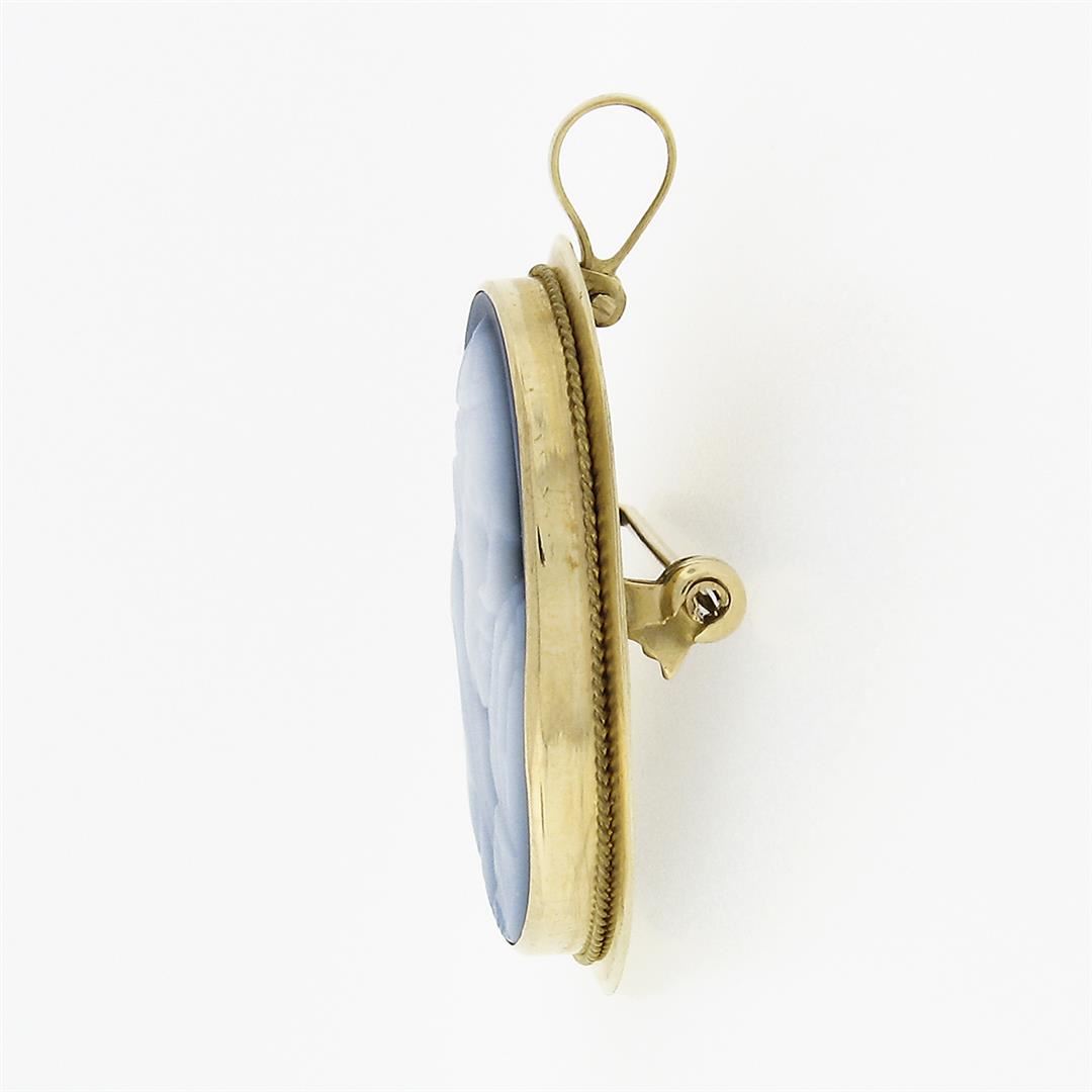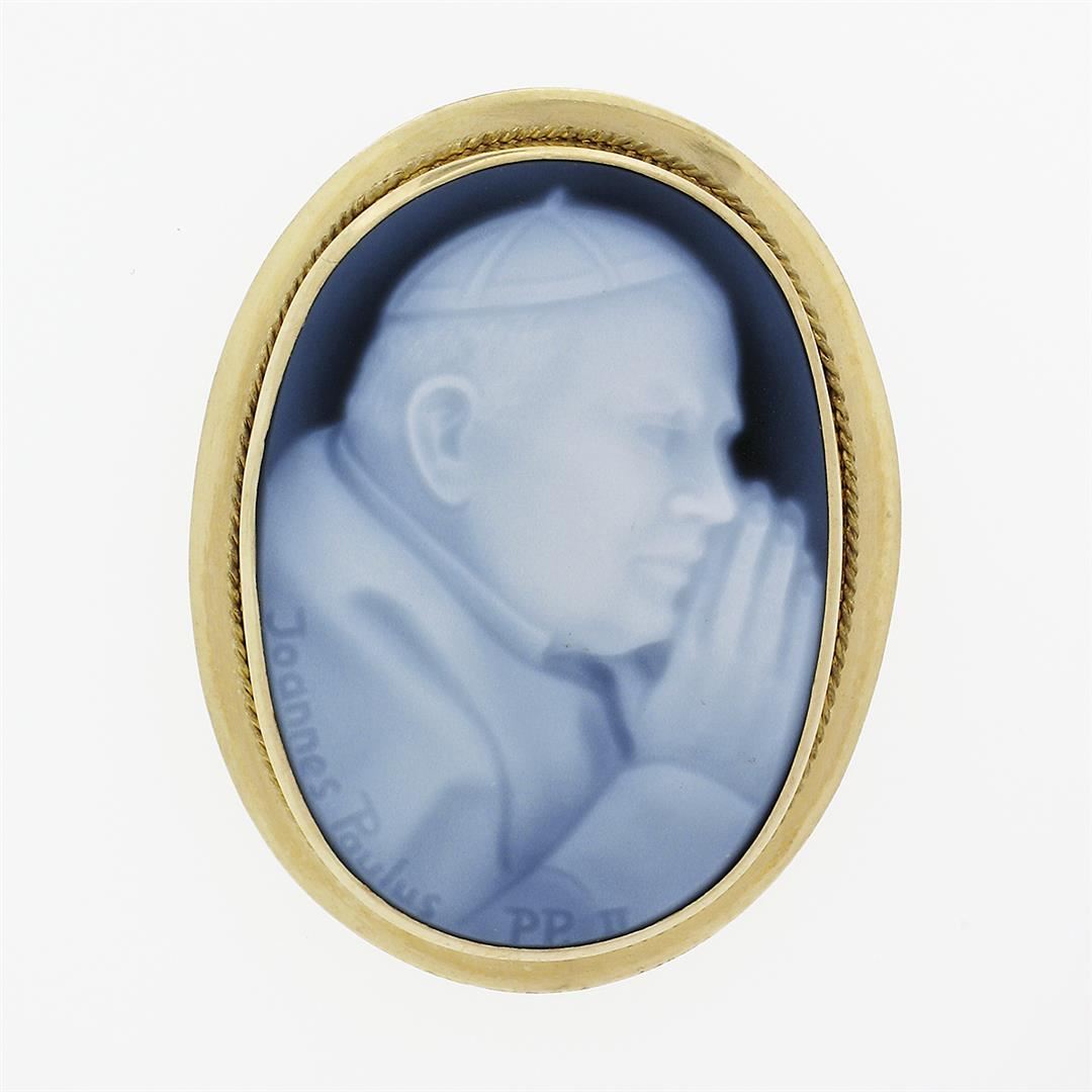 A vintage solid 18k yellow gold pin brooch pendant, with 1 oval shape carved cameo hardstone (24.6x17.5mm). Measures 28.6x22mm and weighs a total of 4.47 grams.