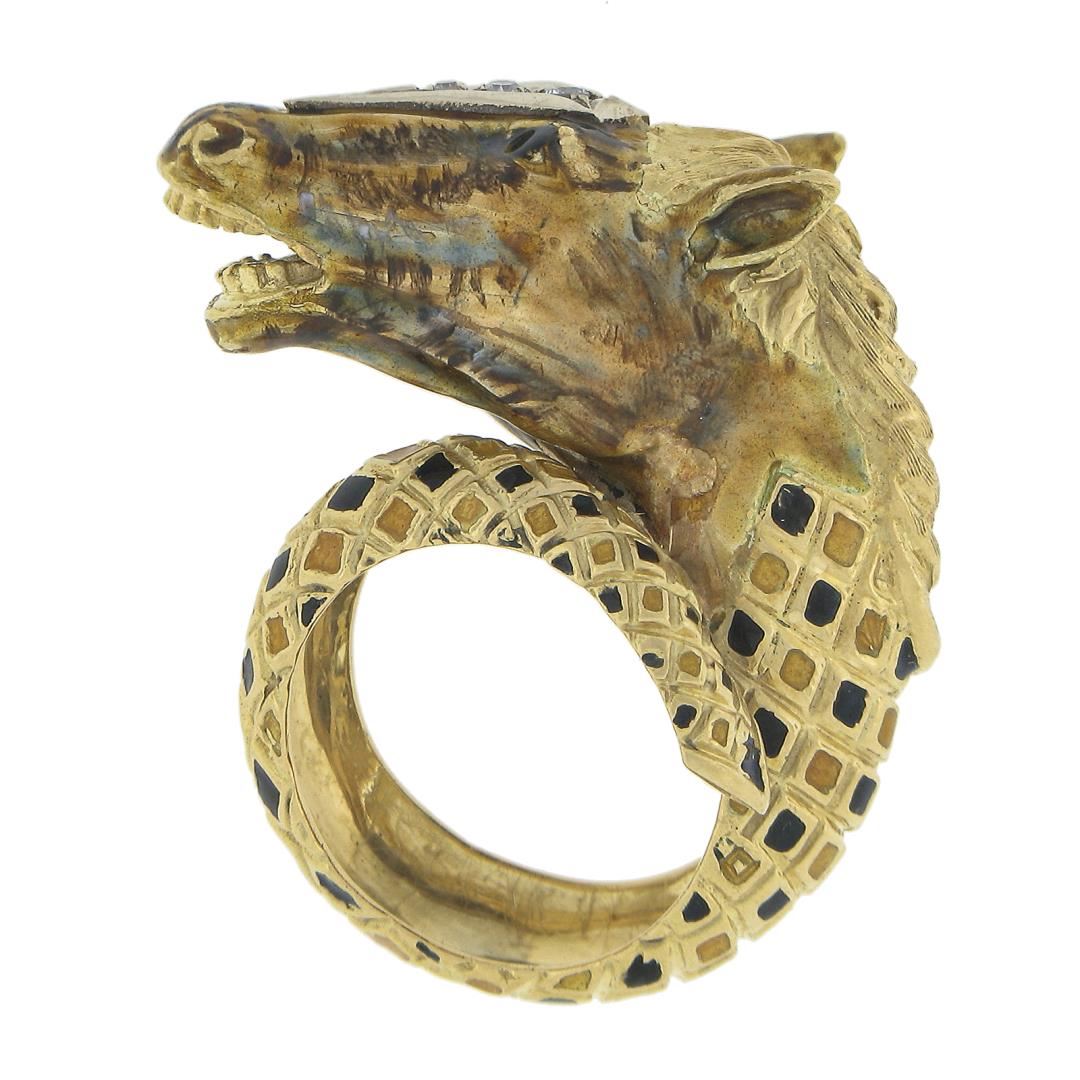 Vintage 18K Gold Detailed 3D Horse Head Band Ring w/ Enamel Work & Diamond