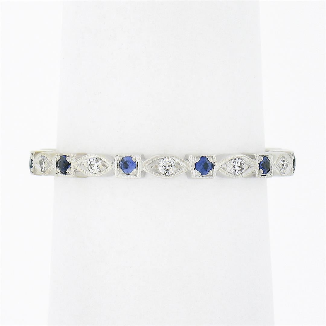 A solid 18k white gold eternity band ring, with 11 round brilliant cut natural sapphires (0.20ctw), and 11 round brilliant cut natural diamonds (G - VS2 ; 0.16ctw). The ring is size 6.0, weighs a total of 2.02 grams, and measures 2.10mm wide.