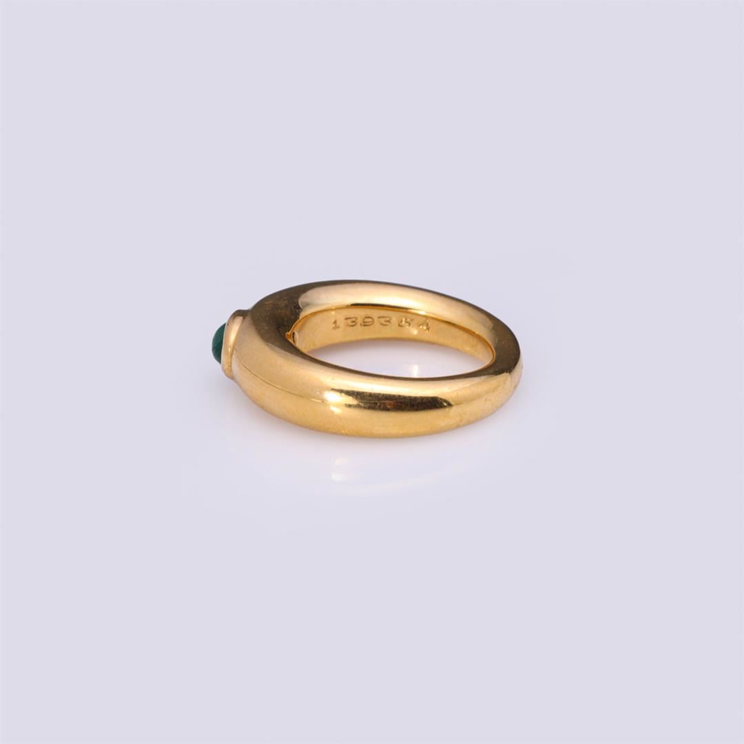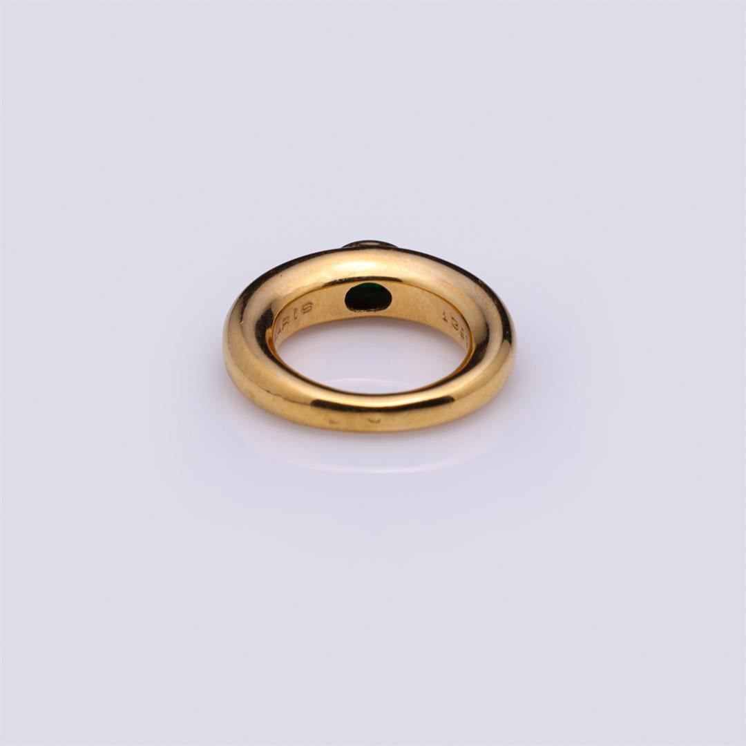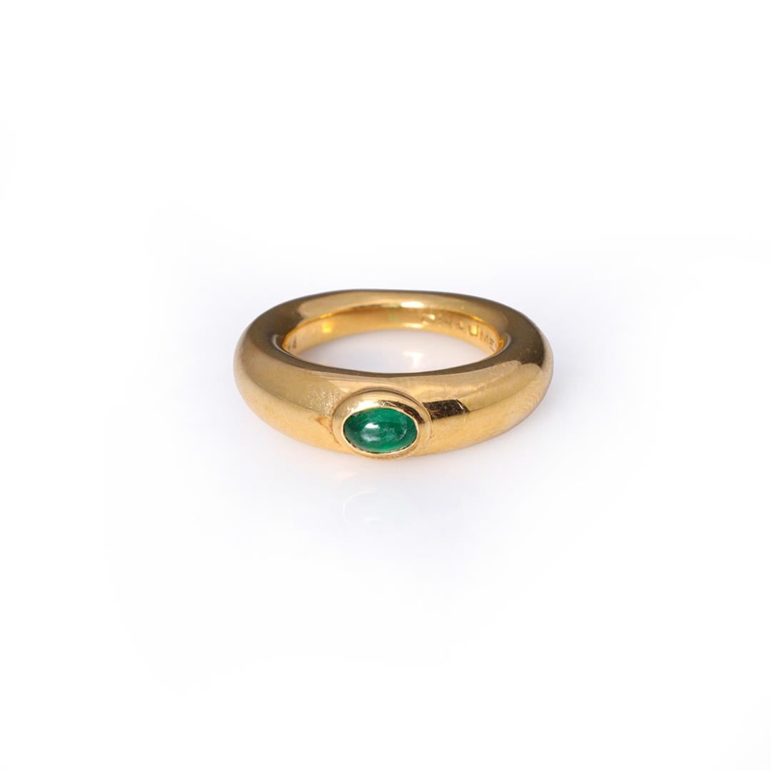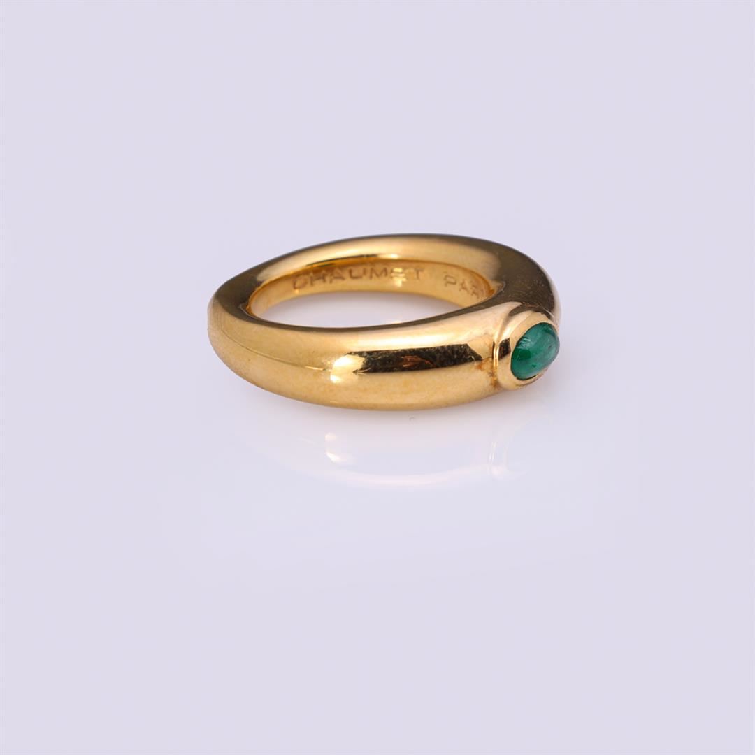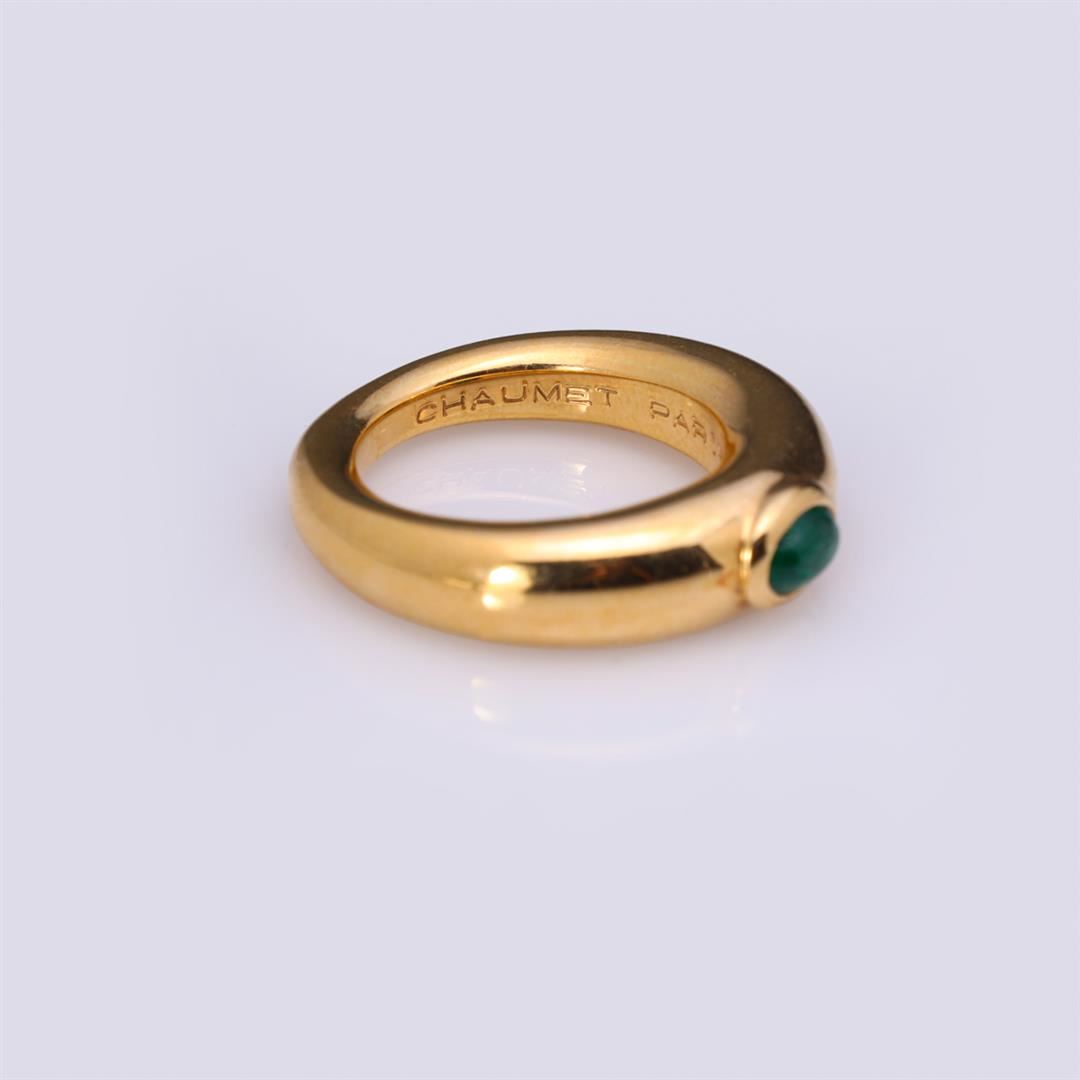 A fine vintage 18k yellow gold ring by Chaumet, Paris; set with a oval green emerald cabochon of fine color in oval bezel, the interior of the ring marked CHAUMET PARIS 139364, with two French touch marks to bottom of shank; gross weight 8.5 g, size 6