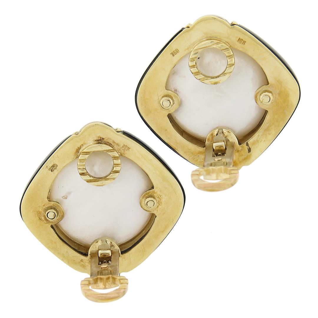 A vintage solid 18k yellow gold button earrings, with 2 round shape cultured mabe pearls (19.6mm each), 20 round cut natural diamonds (G/H - VS1-SI1 ; 0.20ctw), and 4 custom cut natural black onyx.The earrings measure approximately 30.1mm in diameter and weigh a total of 34.05 grams.